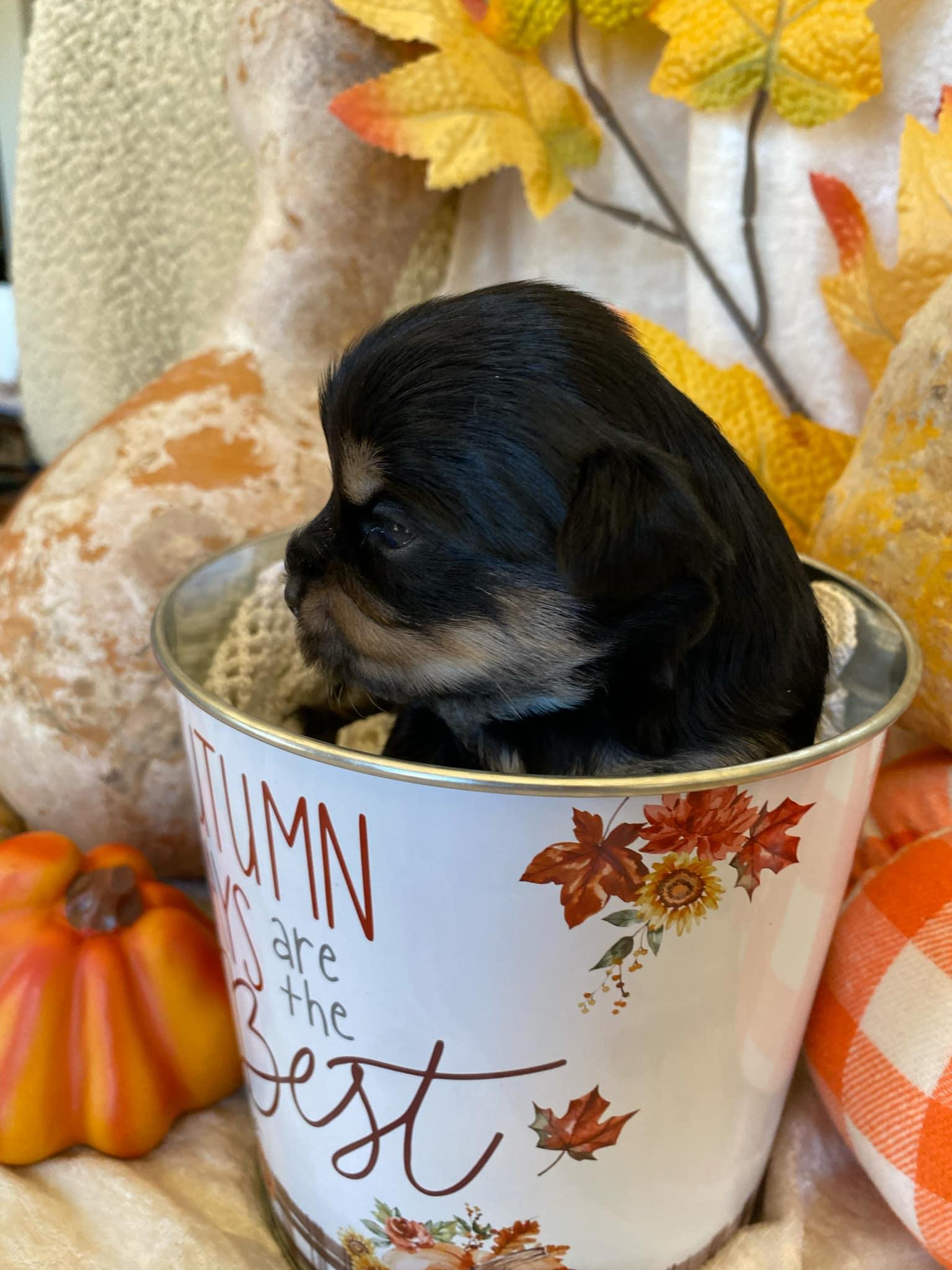 Four pound Fanny is a definite mommas girl. Very protective of all baby puppies and will fight any dog who makes a puppy cry. She gets nervous when mom isn’t around. She has beautiful smooth hair. She trusts her own ability to hold on to you more than she trusts you to safely hold her up. She loves to travel and sleep under the covers. She loves to play with every other animal she encounters regardless of age, gender or species.