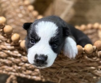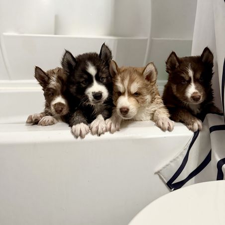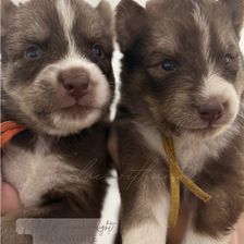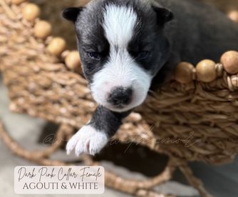 Our puppies include red and white, black and white, sable and white, brown and white, and agouti and white. Colors will vary depending on the parent dogs.