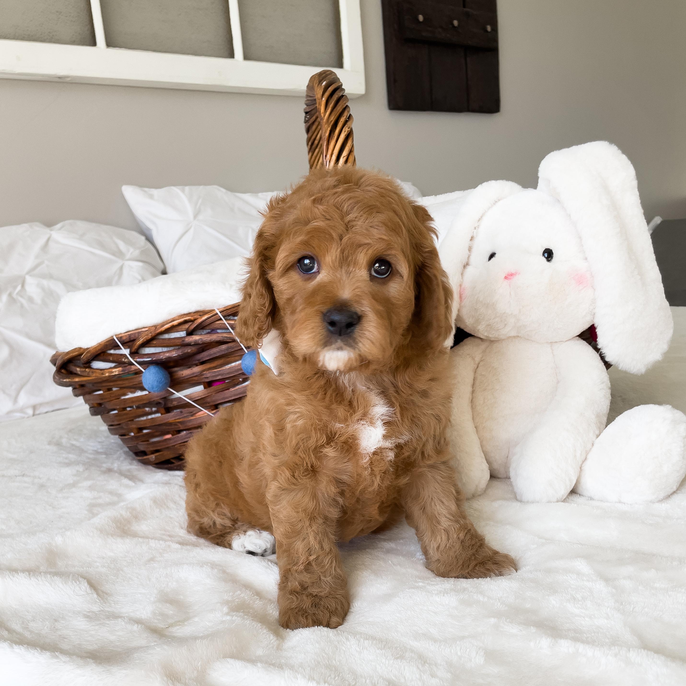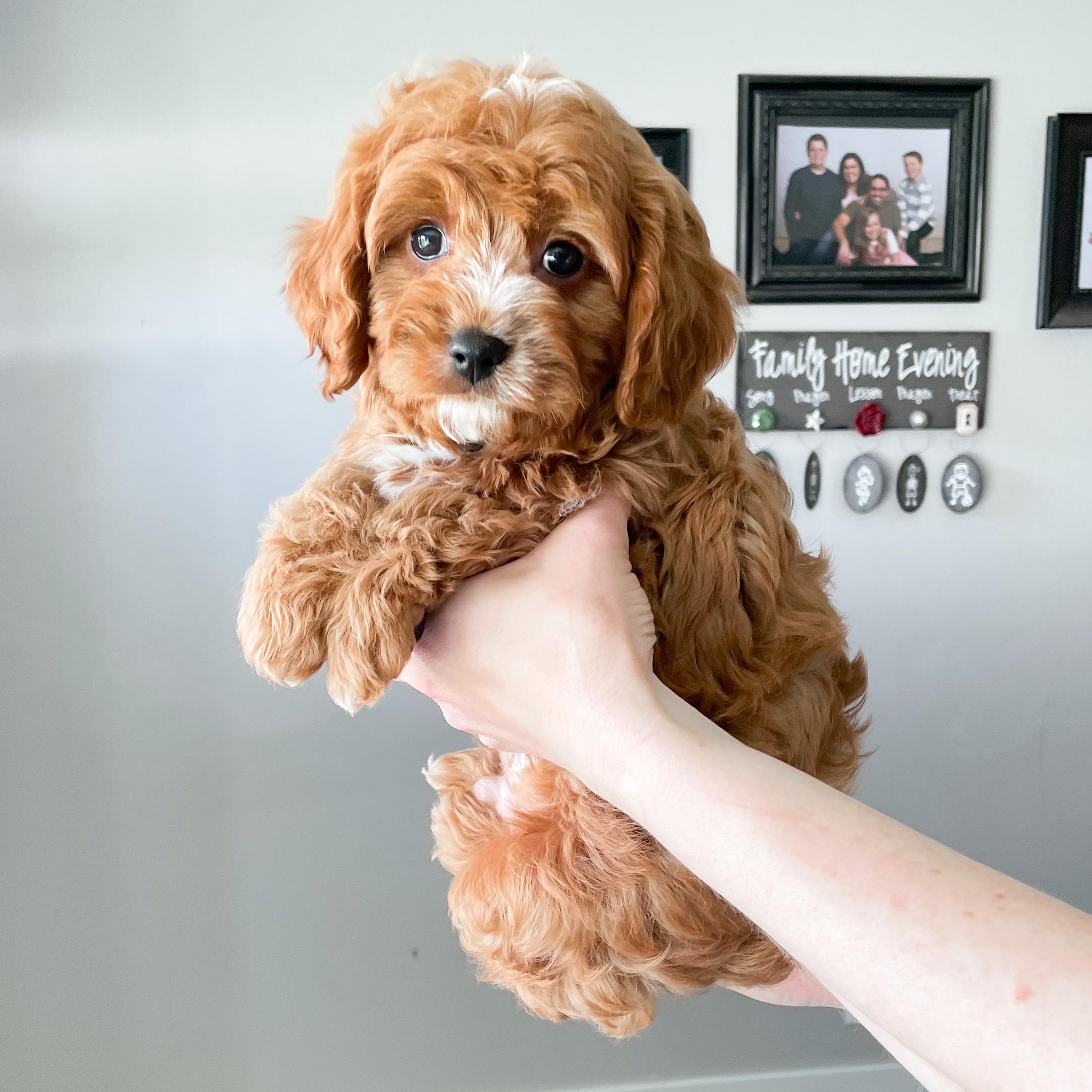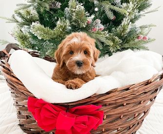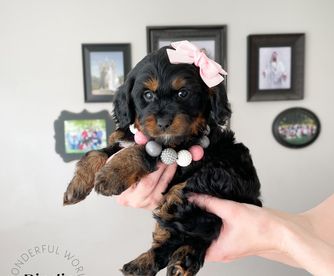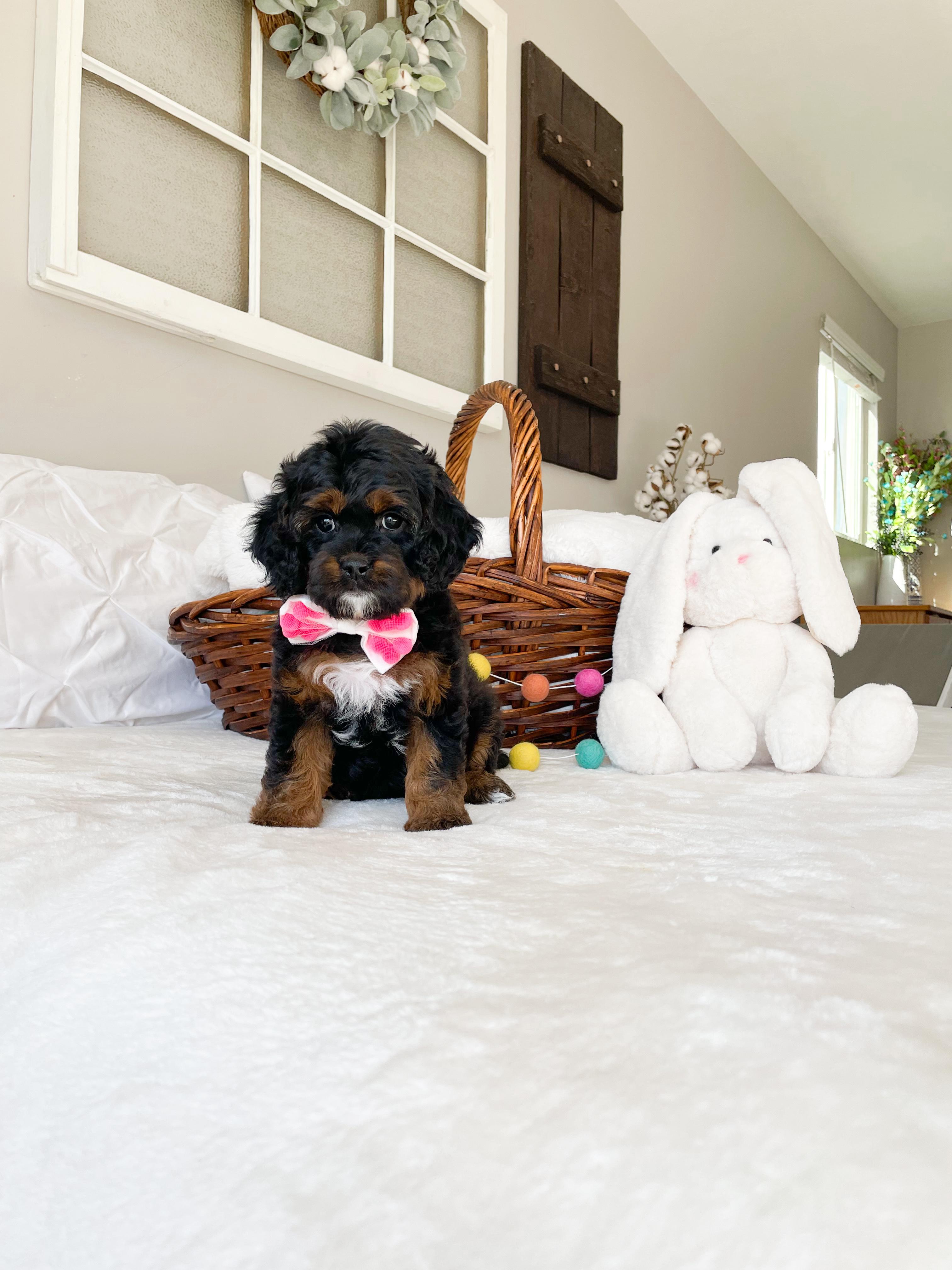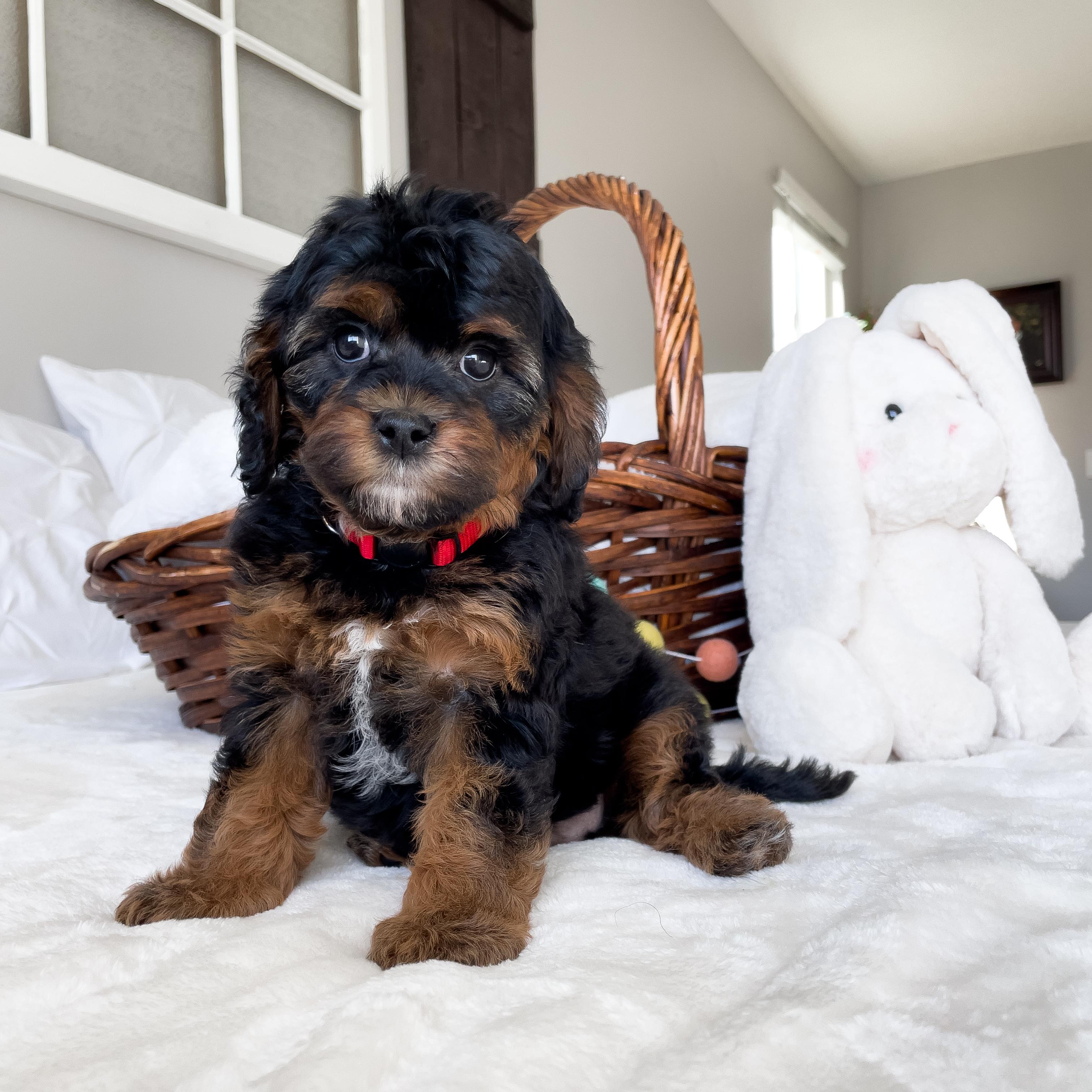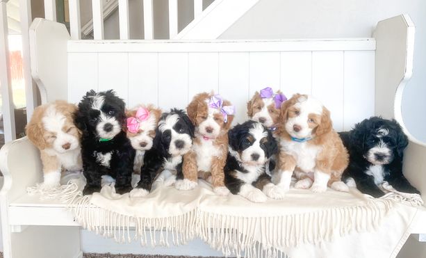 Our Cavapoo puppies include red, apricot, tri-color, and black and tan. Bernedoodle puppies include yellow and white and red. Colors will vary depending on the parent dogs.