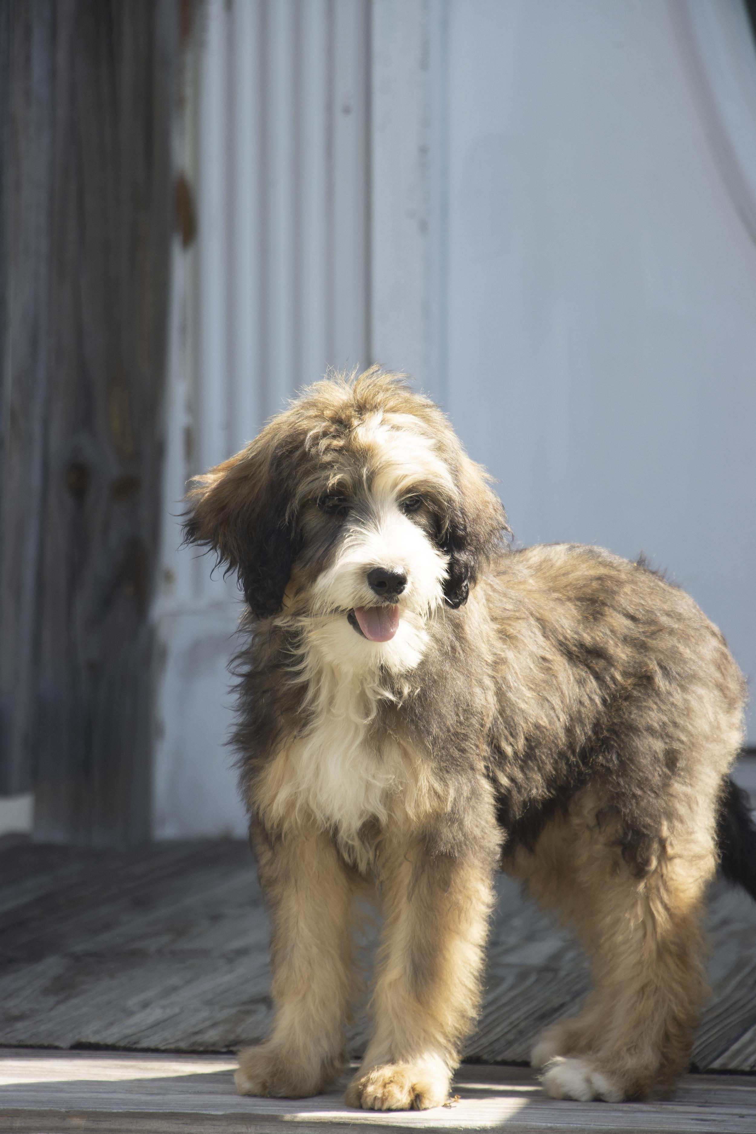 Our Whoodle puppies include merle, cream, and black. Bernedoodle puppies include sable, tri-color, and blue merle. Sheepadoodle puppies include blue merle and black and white. Colors will vary depending on the parent dogs.