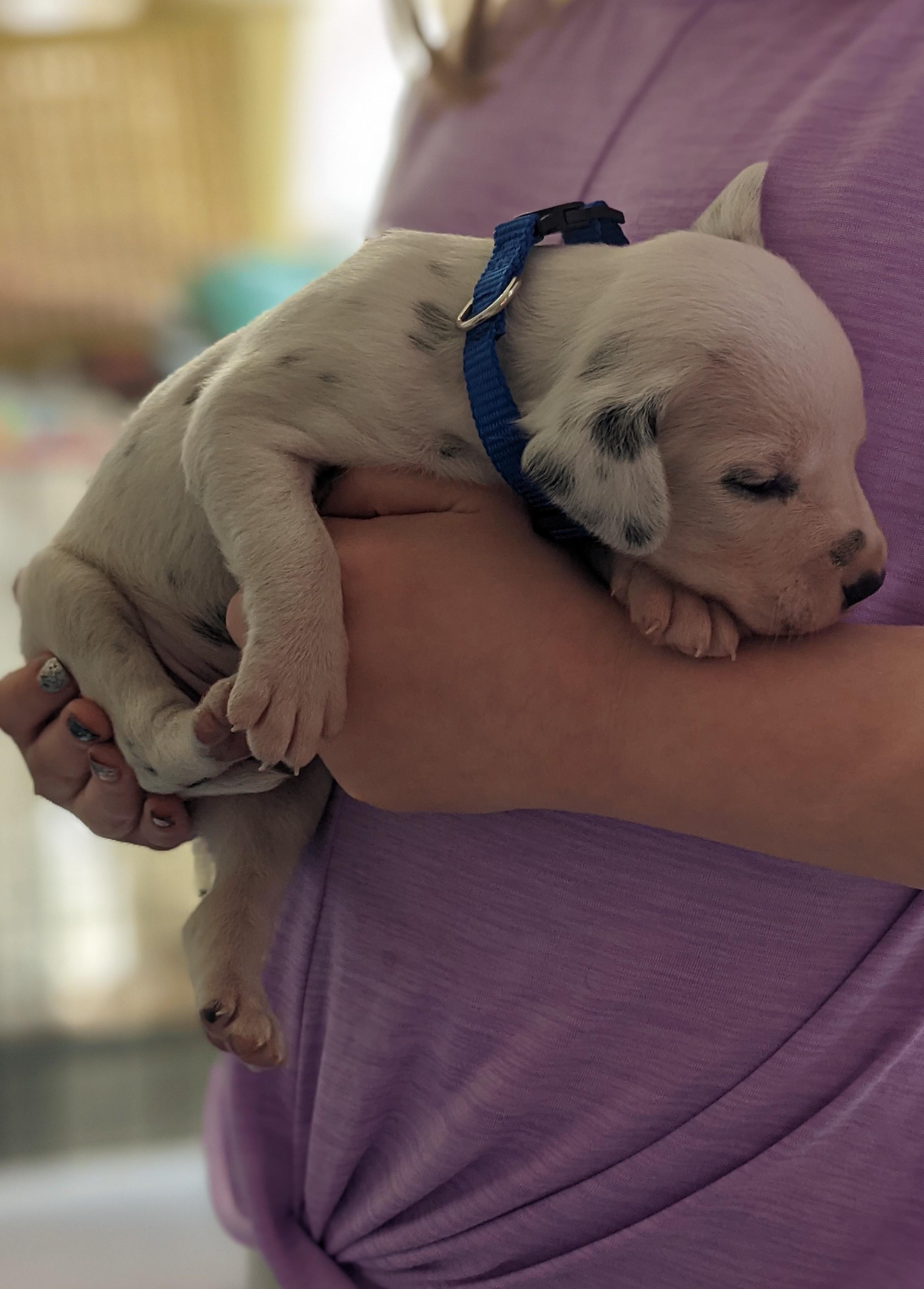 “Also included are the first sets of vaccinations, deworming, an AKC packet, BAER results, a contract, our health guarantee, and a health certificate. The deposit is refundable only if the puppy is deaf or has any health issues found by my vet before leaving.”