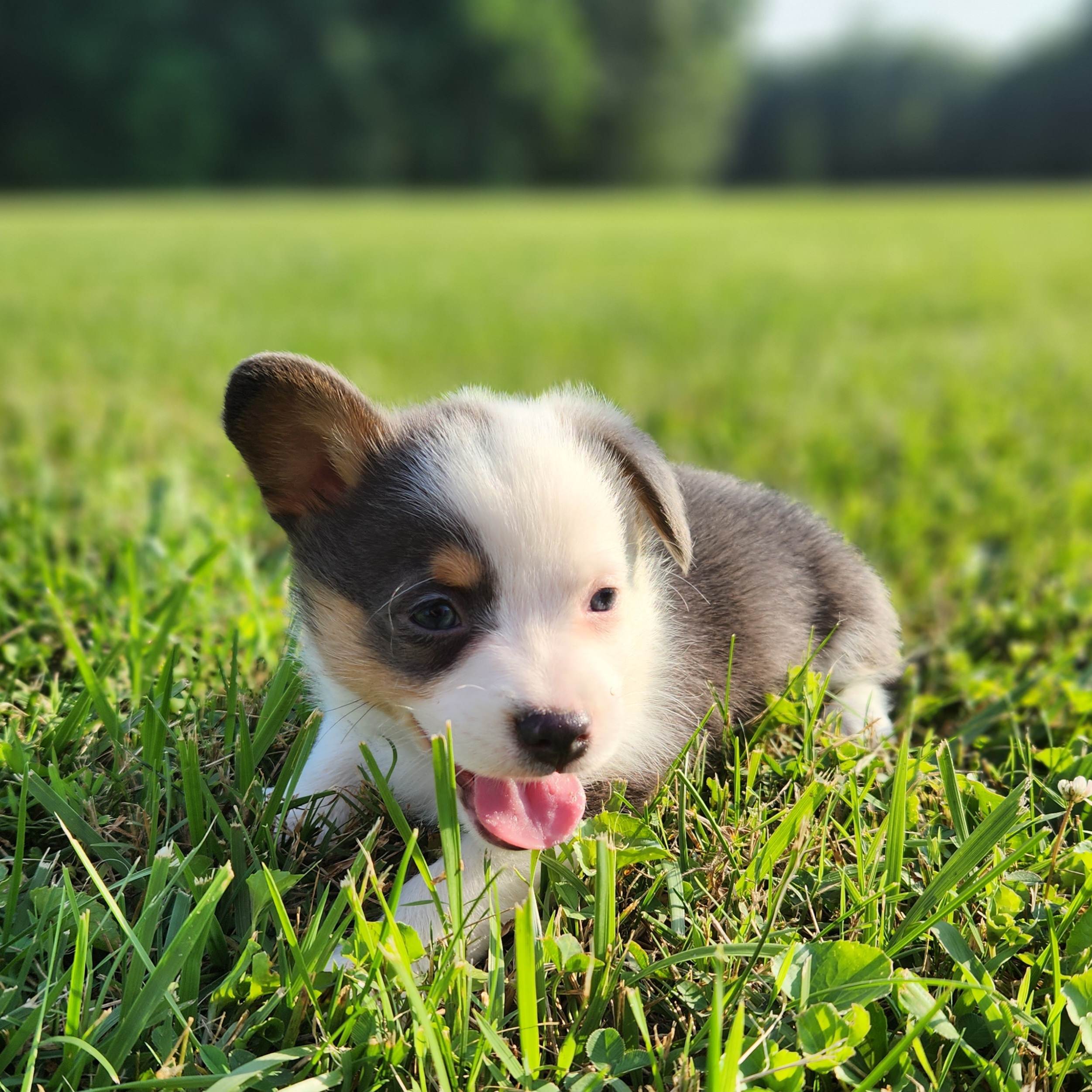 Blue is a beautiful bluie merle corgi with a wide white ruff, four white paws one blue eye and one brown eye. His is tripple clear by parentage. He loves running and playing on our farm, watching movies while snuggling on the couch and playing with kids.