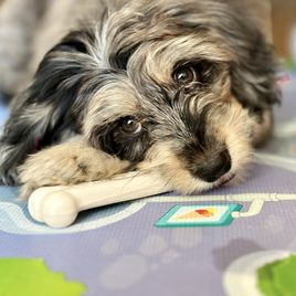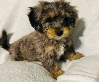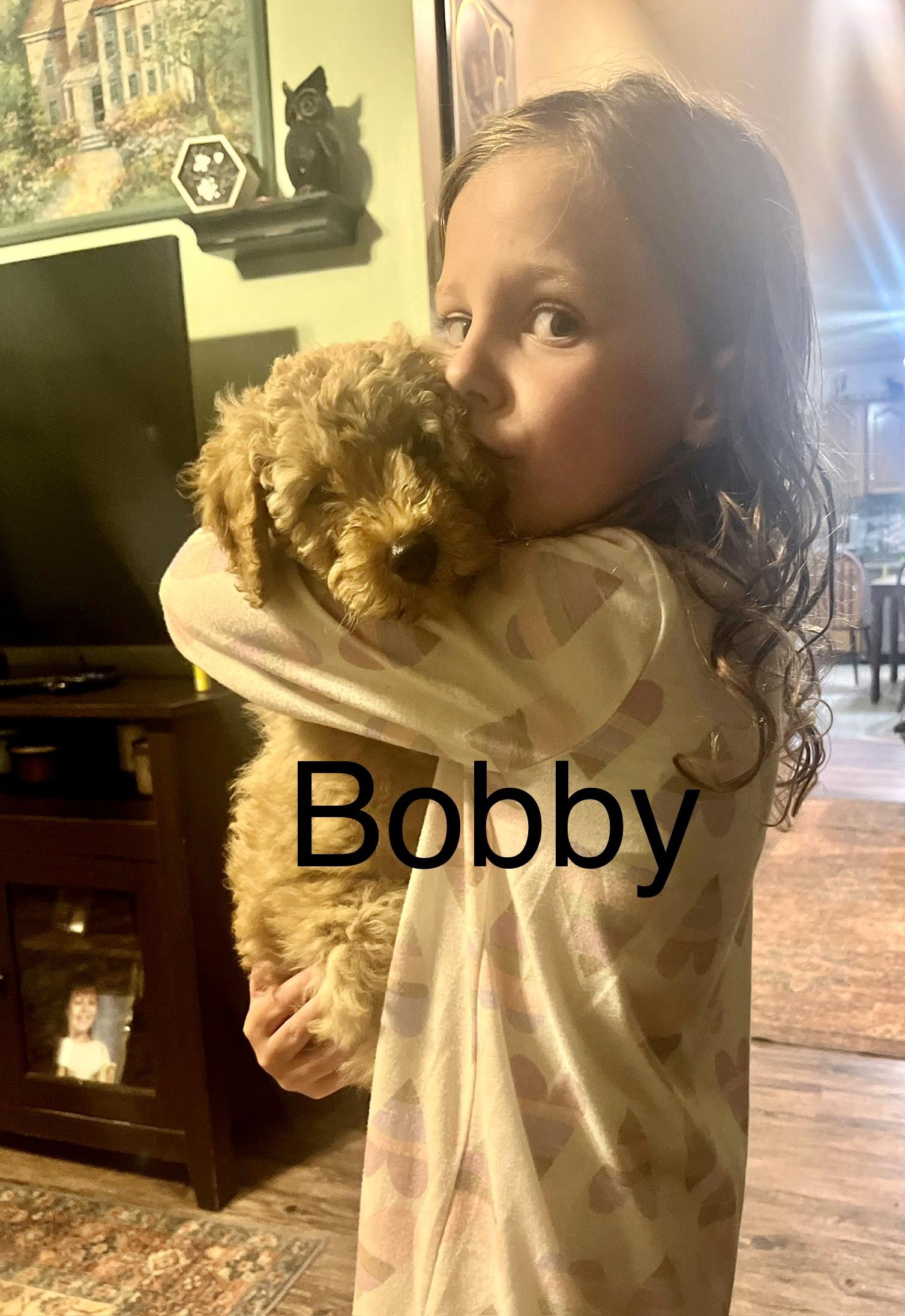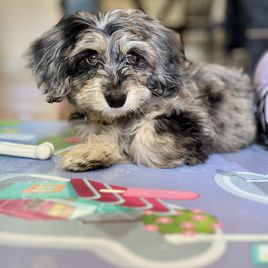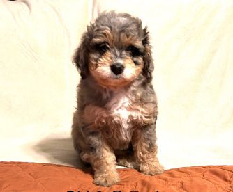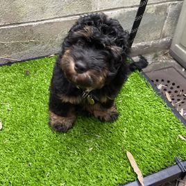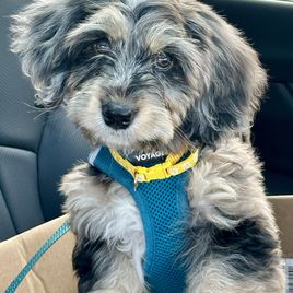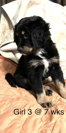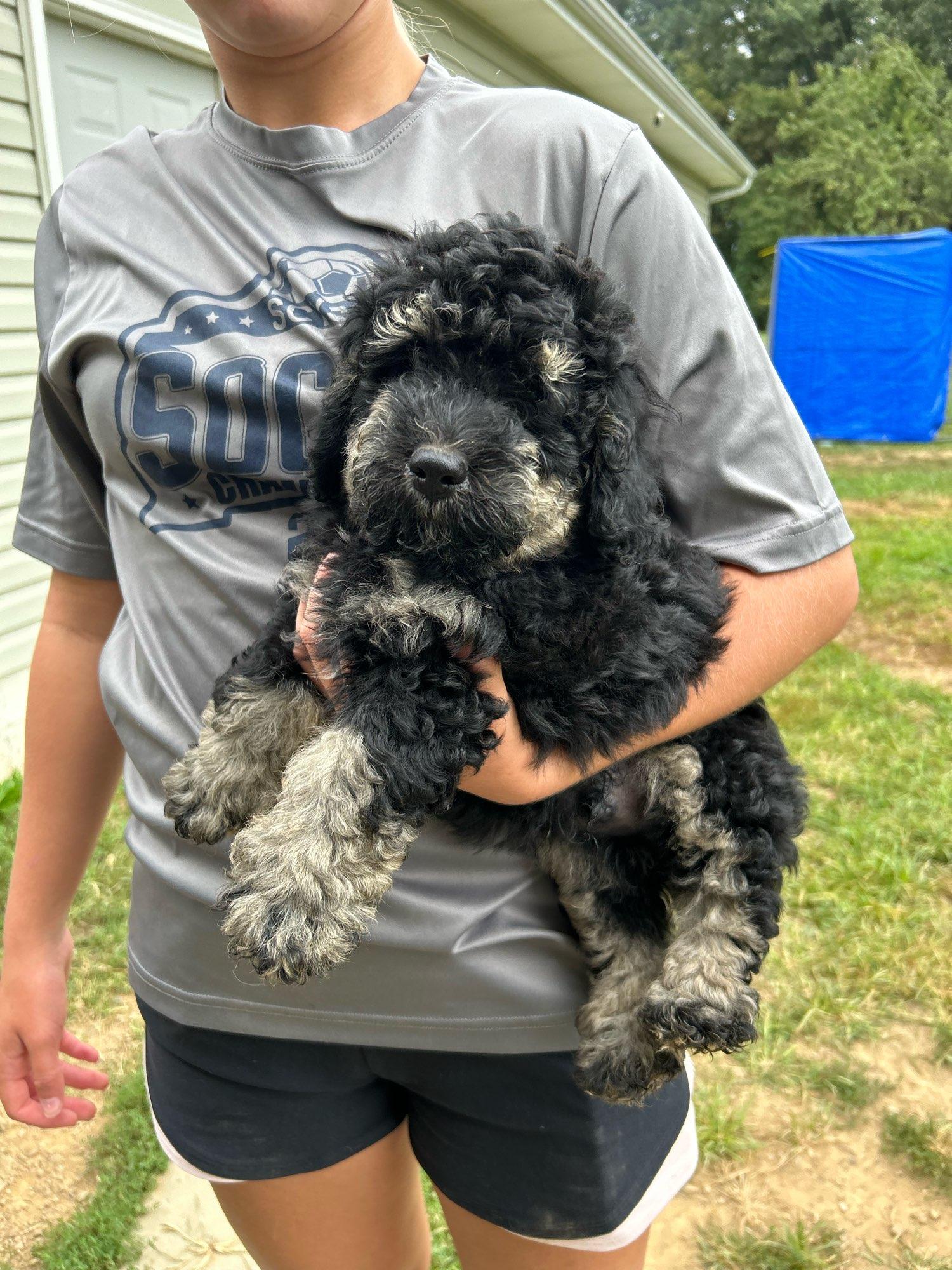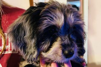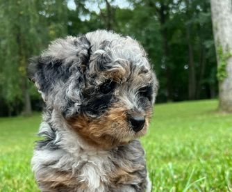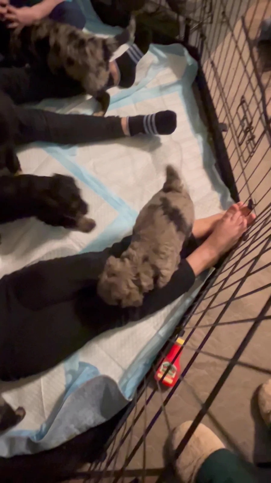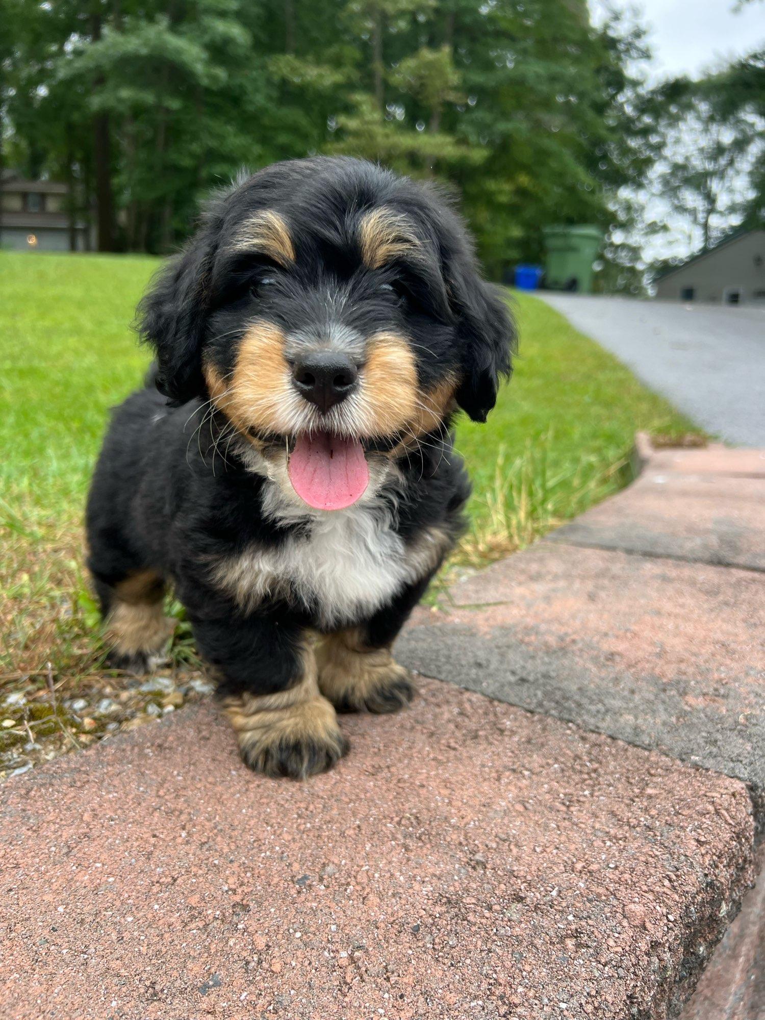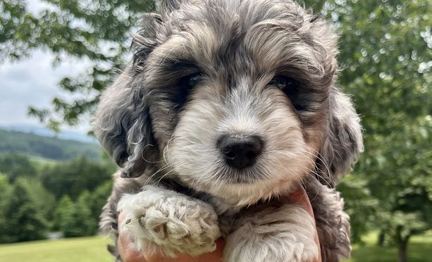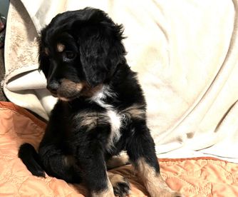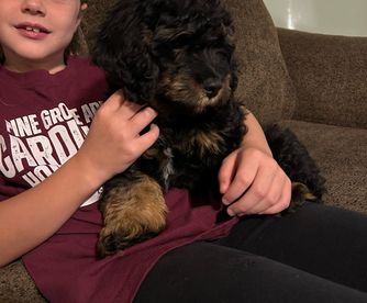 This guy is such a snuggle bug and I can't express how much I love him. He will play or just snuggle in your lap. He is super smart and has learned very early on to ring the bell to go outside. Bourbon has been tested to prove he is a Micro Bernedoodle and also has been cleared of any genetic health concerns.