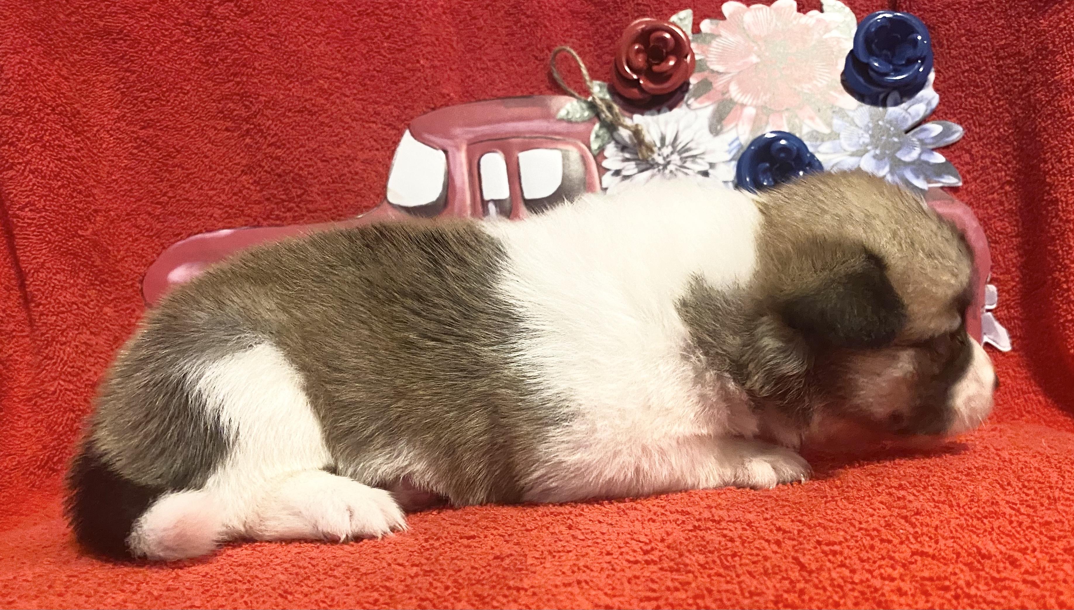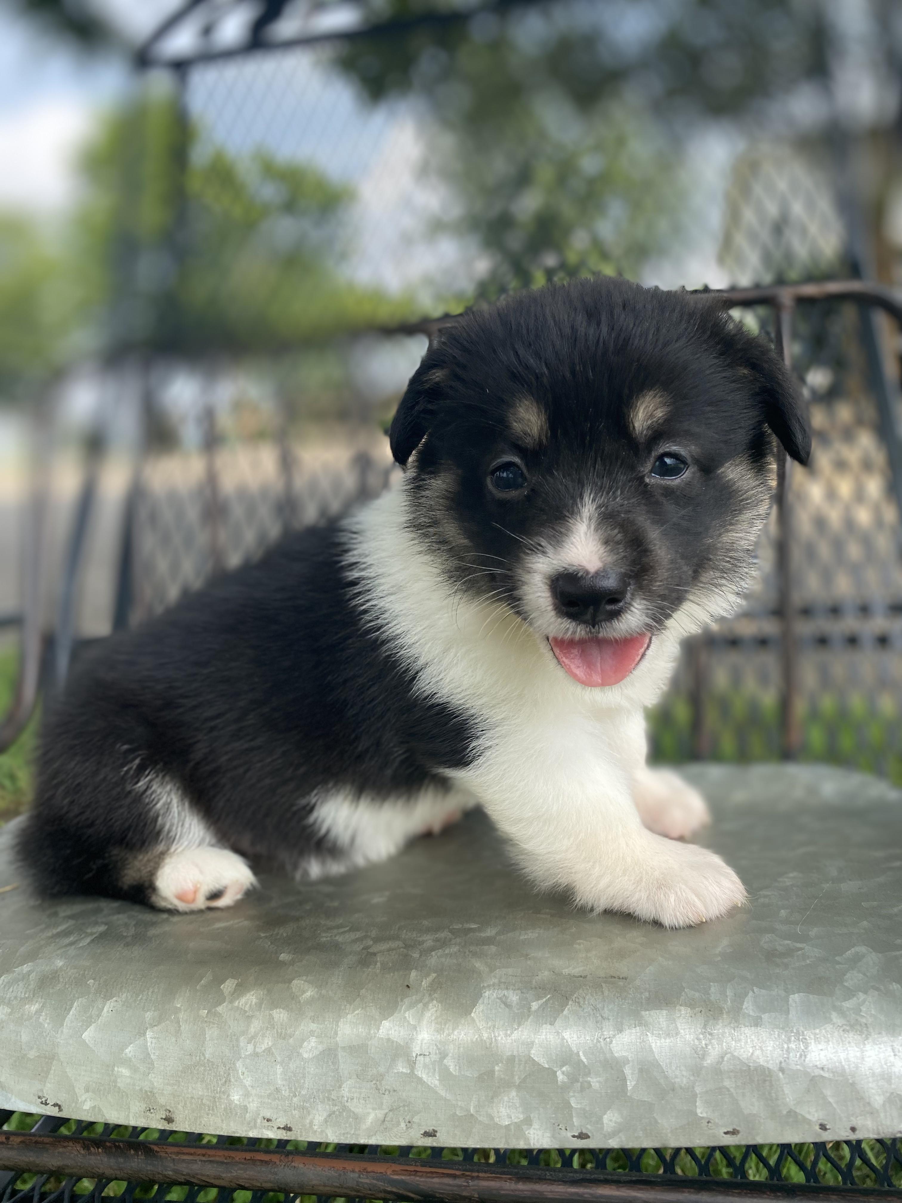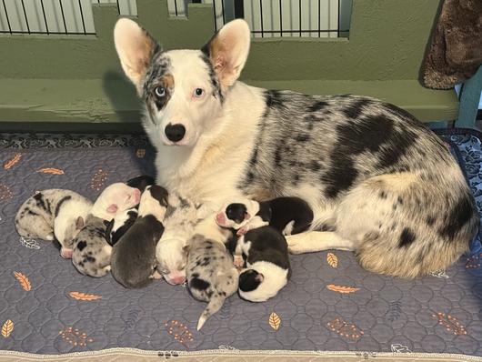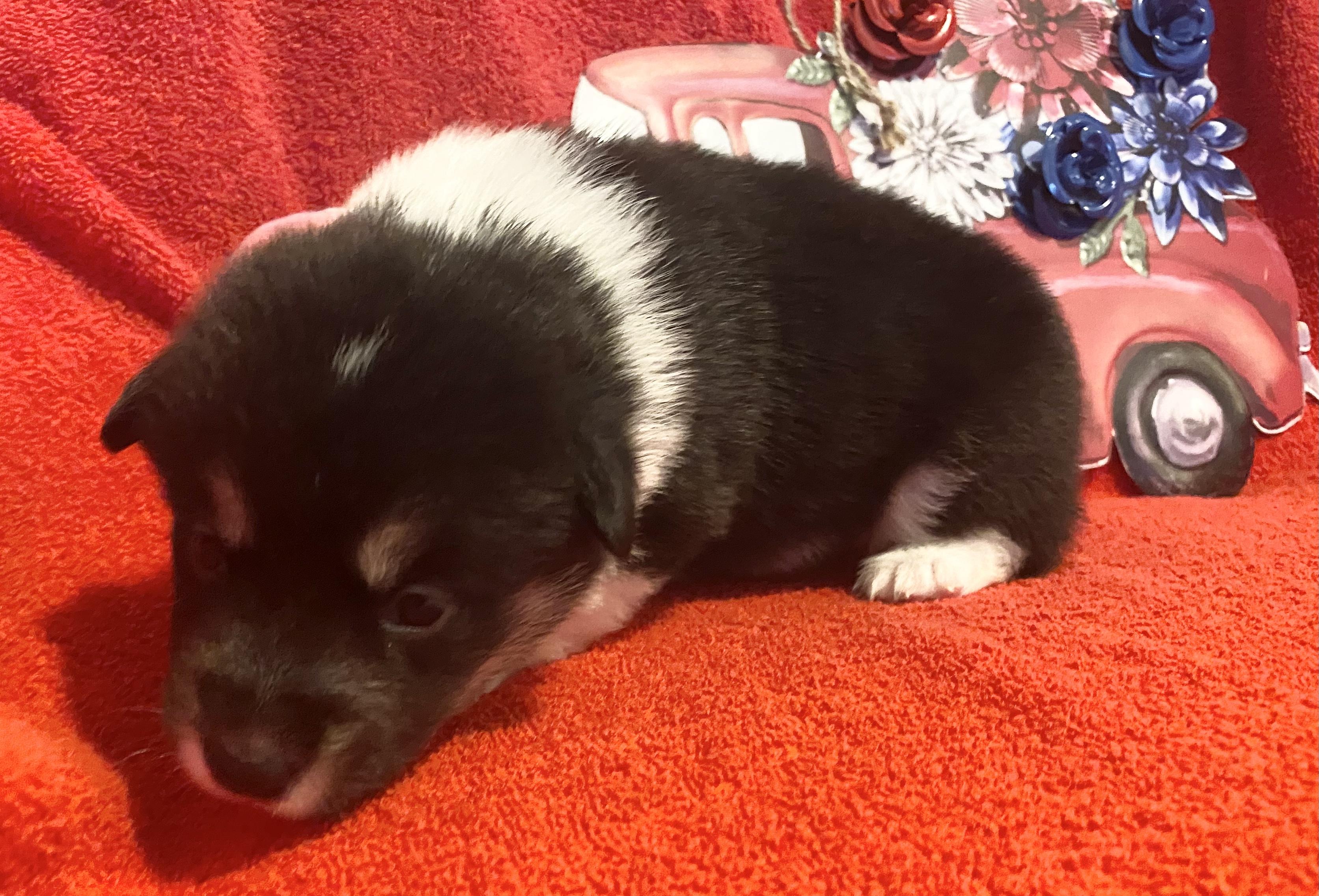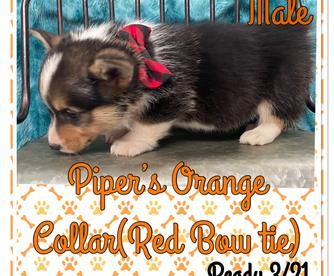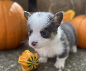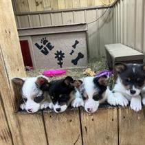 Our Pembroke Welsh Corgi puppies include red, blue, and black and tan. American Corgi puppies are blue merle and white. Colors will vary depending on the parent dogs.