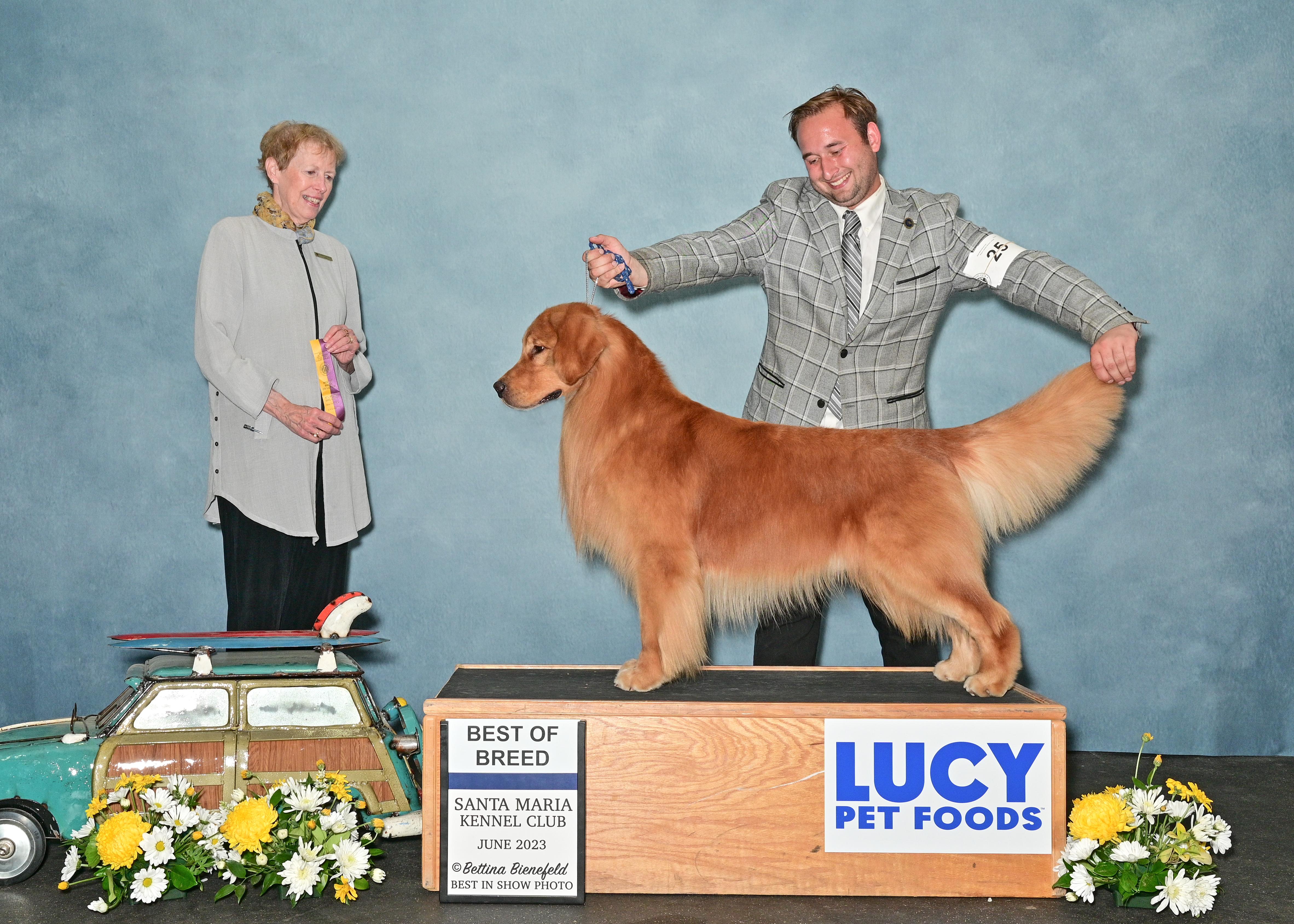 Jaxson is a very correct and gorgeous golden retriever male, as signified by his earning of Bronze Grand Champion with limited showing. He is gentle, loving, and empathic, very easy to be around and live with. He is as happy to watch sports with my husband on TV, as he is to join us on a hike.