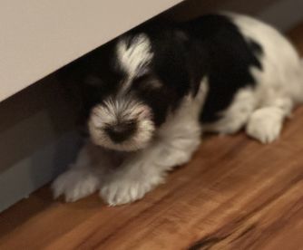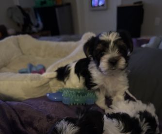 Our Welsh Springer Spaniel puppies are red and white. Biewer Terrier puppies are black tan and white. Colors will vary depending on the parent dogs.
