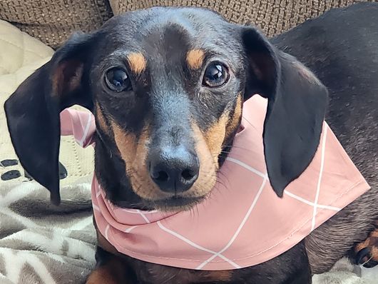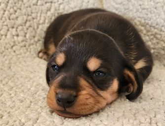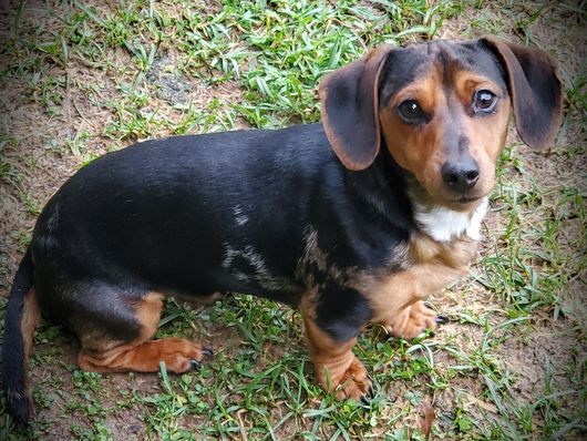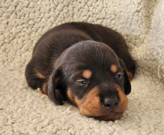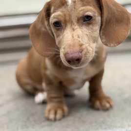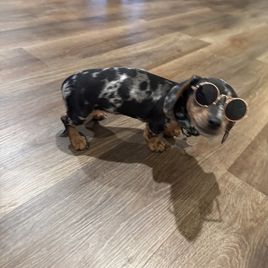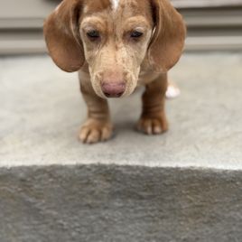 Daisy is a dark chocolate and tan CKC registered, smooth, Miniature Dachshund. She carries the dapple gene. She is a tiny little thing , only weighing in around 8 lbs.