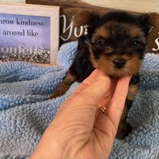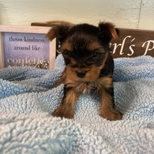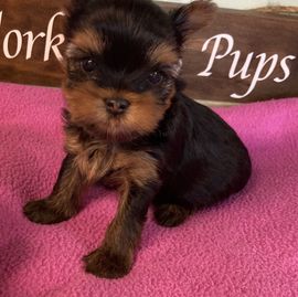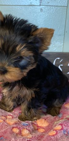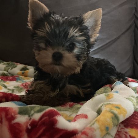 Trixie was born here and loved on since day one! She loves to snuggle and be right by us on the sofa but loves to run and play too. Her favorite pastimes are playing with her Yorkie family and her toys, laying in her bed in the sun, and snuggling with her humans.