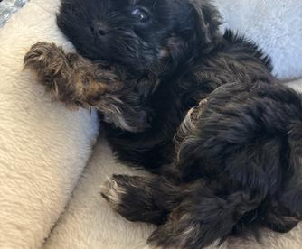 Shih Tzu puppies are black and tan. Yorkshire Terrier puppies are black and tan. Colors will vary depending on the parent dogs.