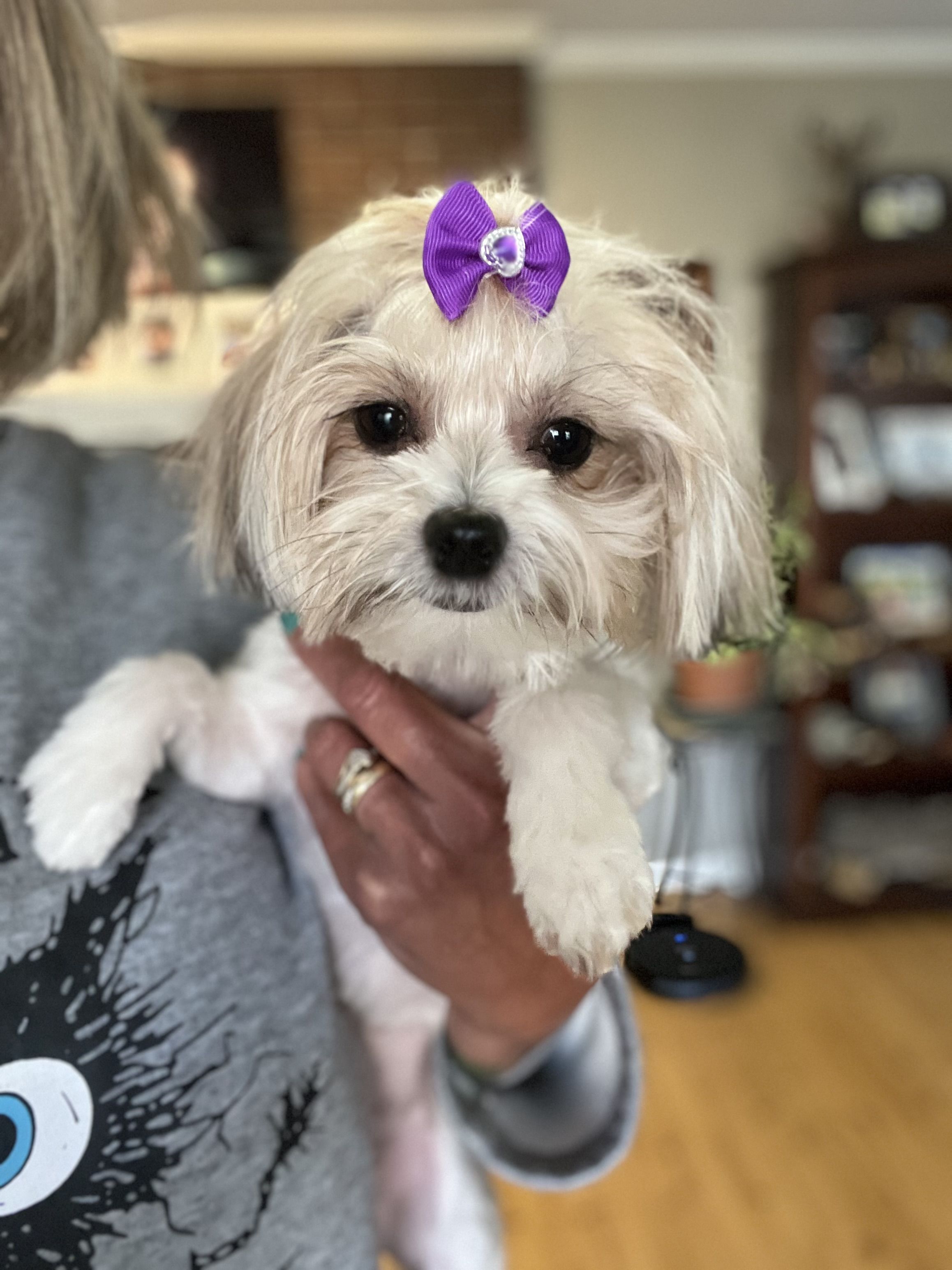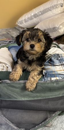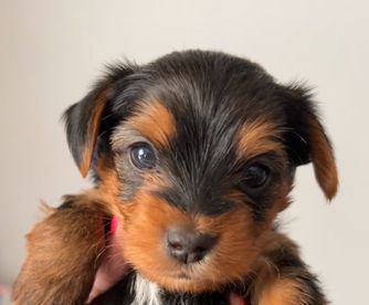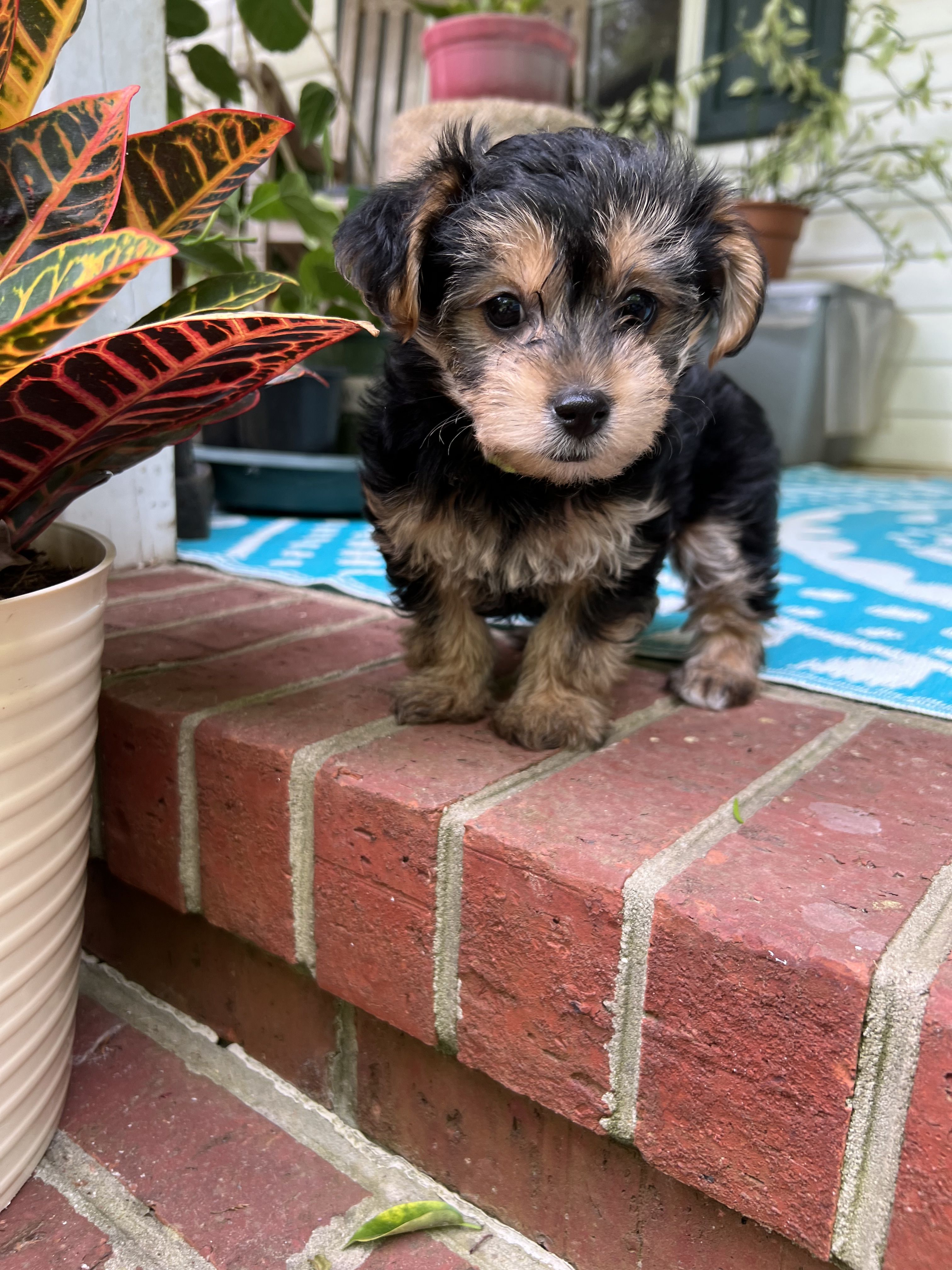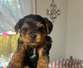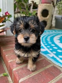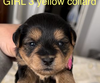 Our Yorkshire Terrier puppies include parti, blue and gold, and black and tan. Yorkipoo puppies include white, cream, and apricot. Colors will vary depending on the parent dogs.