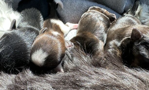 Our puppies include black and white, brindle, black and tan, and black. Colors will vary depending on the parent dogs.