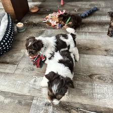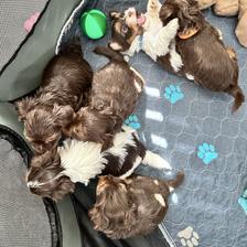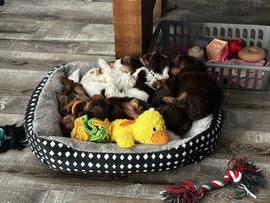 Our puppies include chocolate and tan, chocolate, tan and white, and black and gold. Colors will vary depending on the parent dogs.