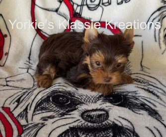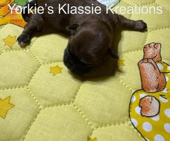 I'm Teresa D., the breeder behind Yorkie’s Klassie Kreations located in Dierks, AR. I work hard to produce healthy puppies, and I take great pride in my breeding program. My focus is on maintaining the Yorkshire Terrier standard by raising structurally sound pups with excellent temperaments and great health. All of the parents have been health tested through Embark. I love what I do and strive to produce the best puppies for my buyers.