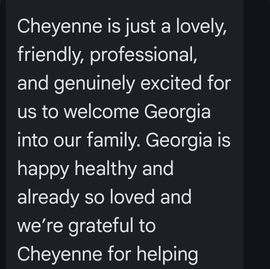Cheyanne was wonderful, and the puppy is amazing. We named her Daisy, she's vibrant, smart, and took to potty training almost immediately. Daisy brings smiles to our faces and is in excellent health. So I would recommend Cheyanne to anyone who wants a puppy go for it!