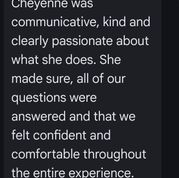 Working with Cheyanne was wonderful!! She answered all of my questions all of the time. It was kind of ridiculous how many questions I had and she had so much patience with me even though she had just had a baby and I know she had to have been exhausted. You cannot go wrong working with her. I haven't had any issues with my baby Calliope, she's perfect.