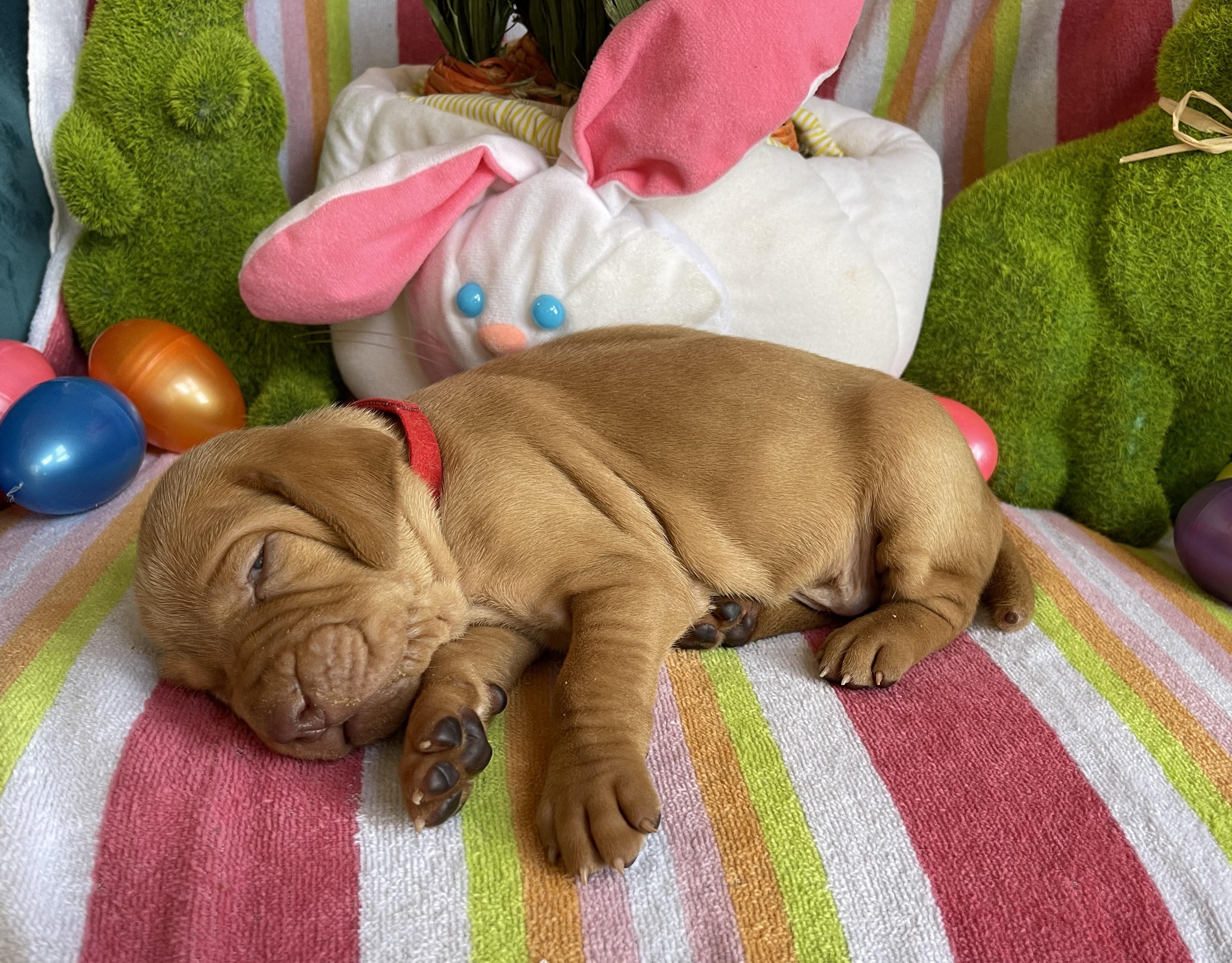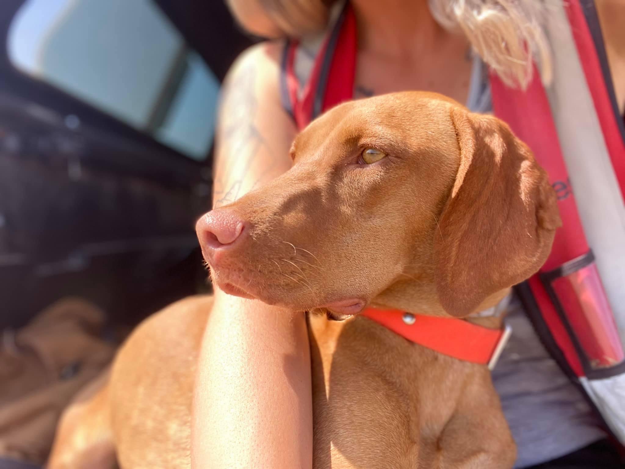 Etta is a female Vizsla. Carefully selected as a great representative of her breed, Alexandria decided to make her part of their program. Alexandria has passed Good Dog’s screening process, which involved a review of their breeding practices, environment, and the mental and physical health of their dogs.