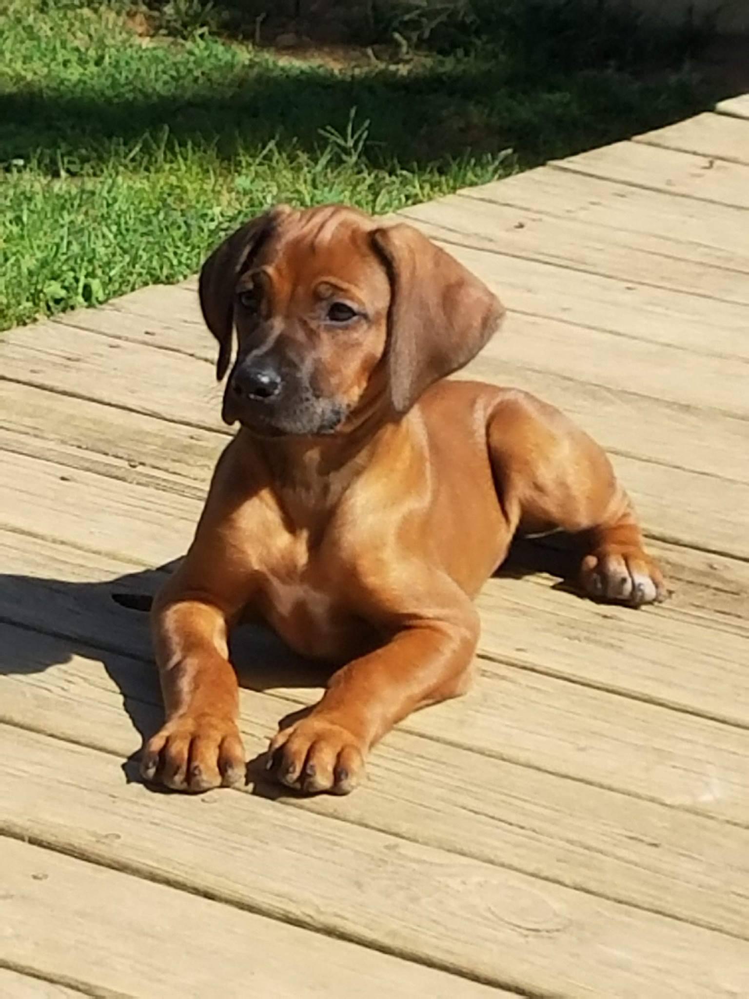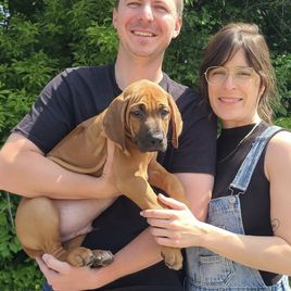 We couldn’t be happier with our experience bringing Arnold home and working with Robin. From day one, Robin has been incredible — knowledgeable, patient, and always quick to answer our (many!) questions as first-time Ridgeback owners. It’s clear how much love, care and thought she puts into her puppies, it shows in Arnold’s temperament. He came to us healthy, confident and already showing the smart, loving personality we hoped for. Robin made the entire process smooth and stress-free. She truly went above and beyond to prepare us for life with our new best friend. We feel so lucky to have found both Arnold and such a wonderful breeder. We would highly recommend Robin to anyone looking for a well-bred, well-raised Rhodesian Ridgeback.