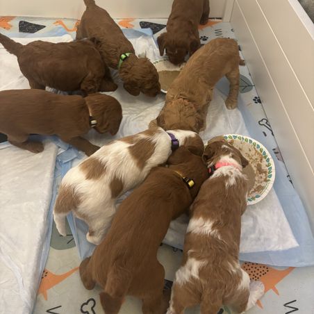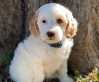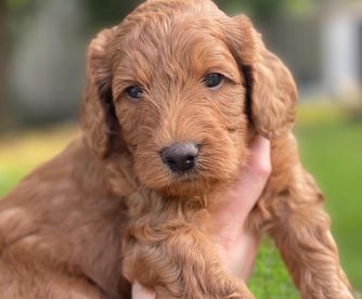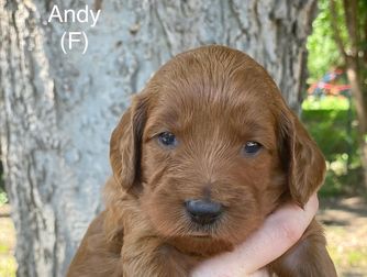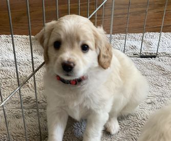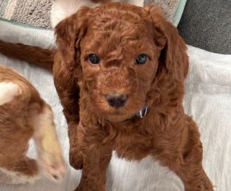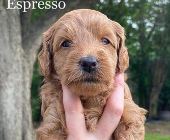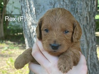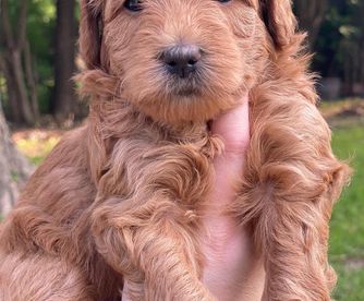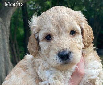 Our Bernedoodle puppies include sable and black and white. Goldendoodle puppies include cream, apricot, red, and parti. Colors will vary depending on the parent dogs.