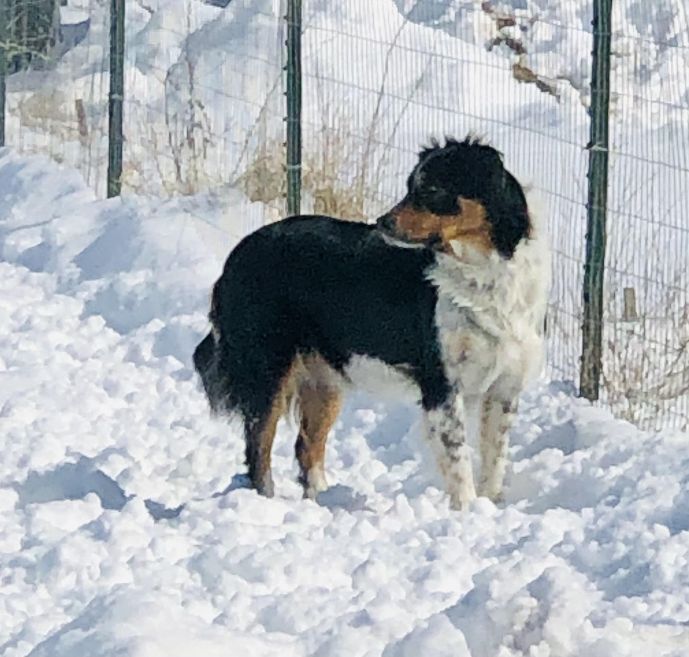 Reddy takes his role seriously watching over home and farm. When you bring out the jolly ball he is ready to play and have fun. With people he knows he is friendly and affectionate, outside he patrols fence lines watching for any critters that should not be there. He is a proven producer of healthy, structurally sound, teflon coated, intelligent pups with great herding ability.