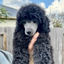 We have one male silver miniature available. He should be around 15-18 lbs when full grown. He is out of two AKC champion min poodles.