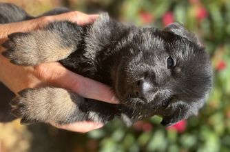 Our German Shepherd puppies have stock coats. Dachshund puppies have wirehaired coats. Coat types may vary depending on the parent dogs.