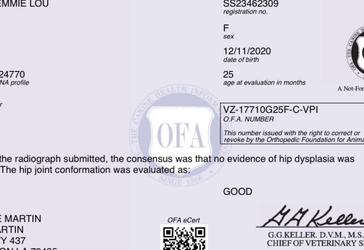 Hip Dysplasia Finals (OFA, PennHIP, BVA, SV, FCI) is a complex condition involving both genetic and environmental factors that can cause varying degrees of pain and loss of function in the affected joint. No genetic test is available to date, therefore, the recommended screening test is x-rays. Definitive reports include OFA radiographs taken after 2 years of age or another recognized screening and grading program (e.g. PennHIP, BVA, SV, FCI) following the validated process and minimum age for that organization.