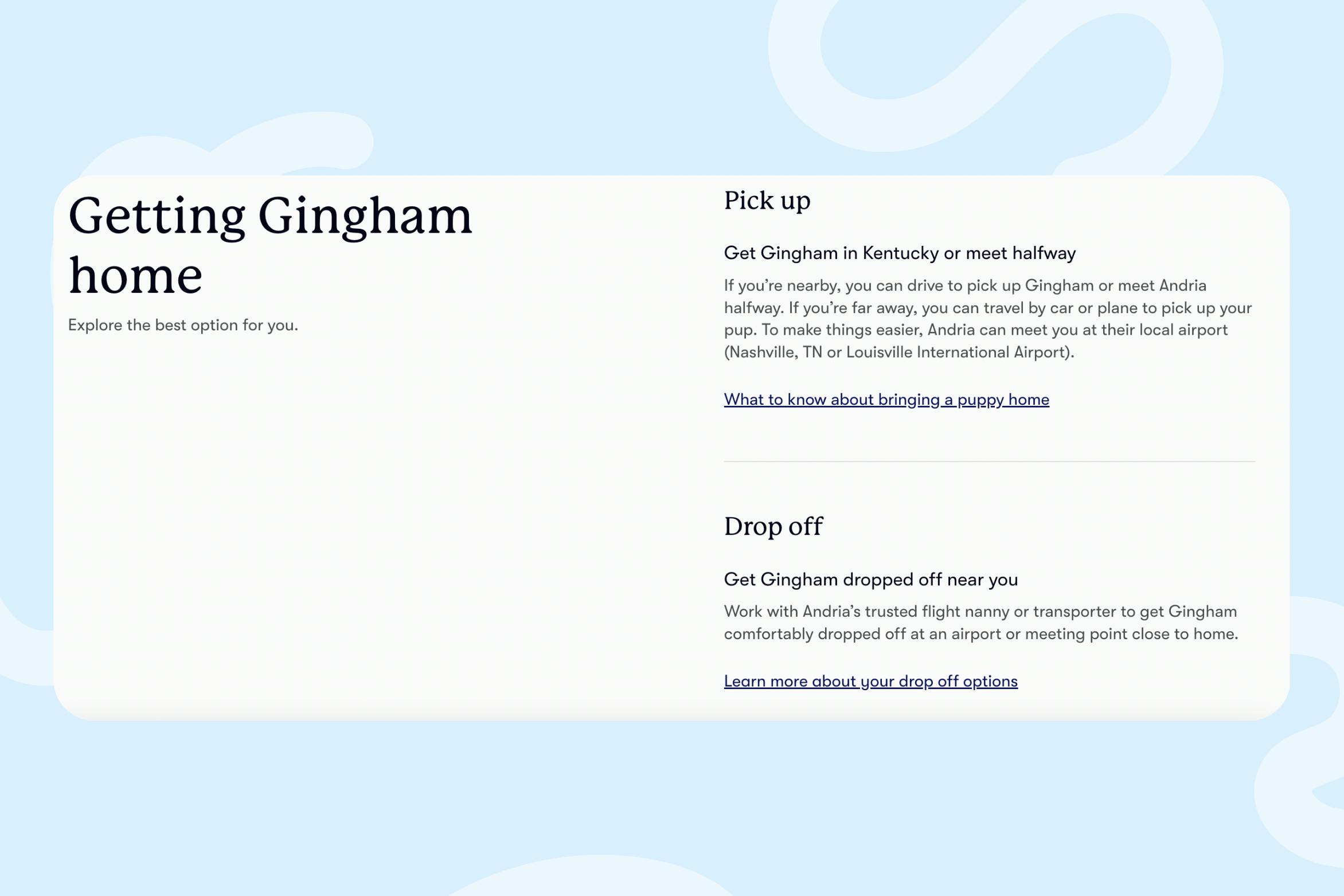 Be sure to include all of the pickup and drop off options you offer (like if you’re willing to fly and meet at a buyer’s local airport), and keep this information up to date as you’re able to offer new transport options. Some Good Dog buyers may have questions and will want your advice before finalizing their choice.