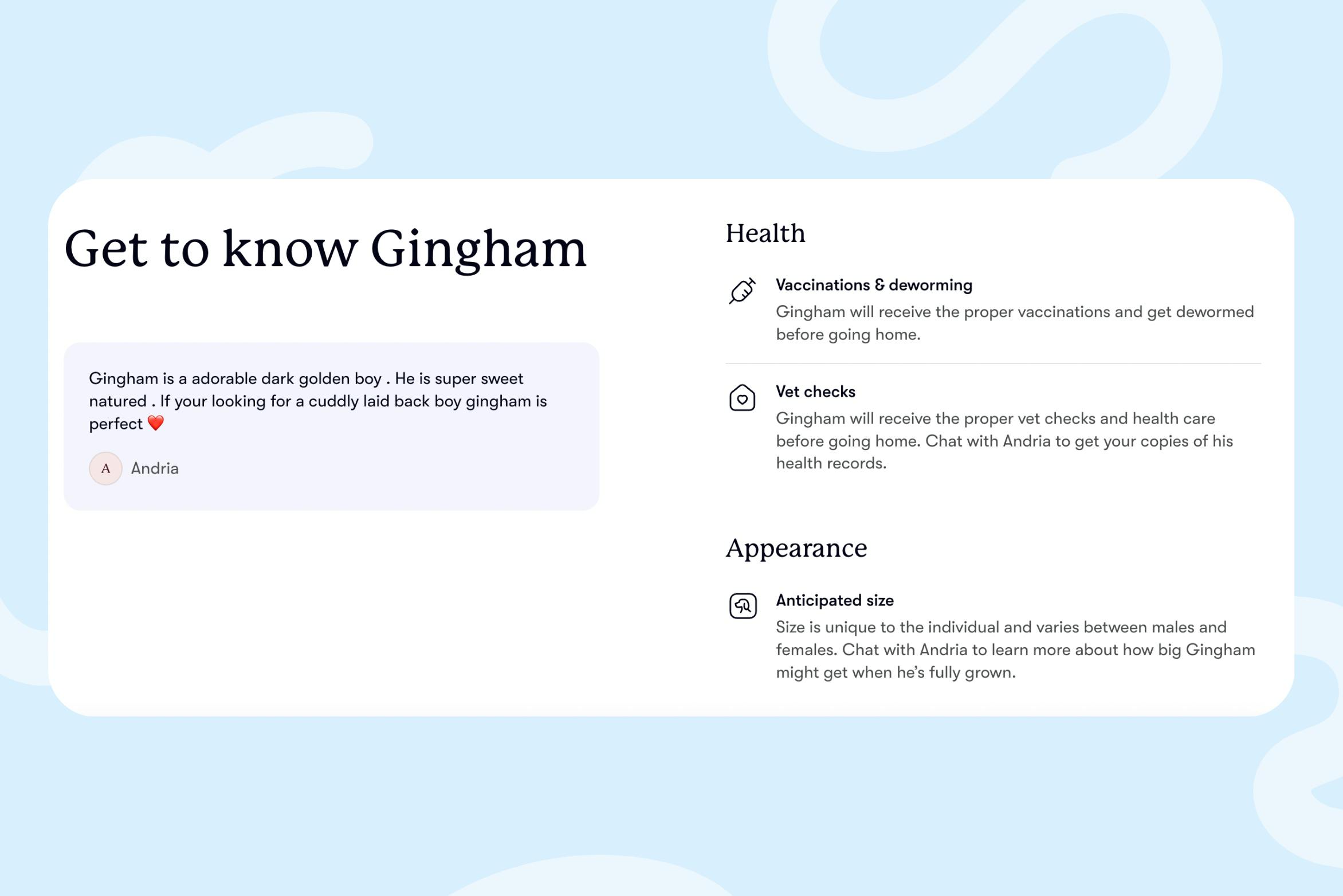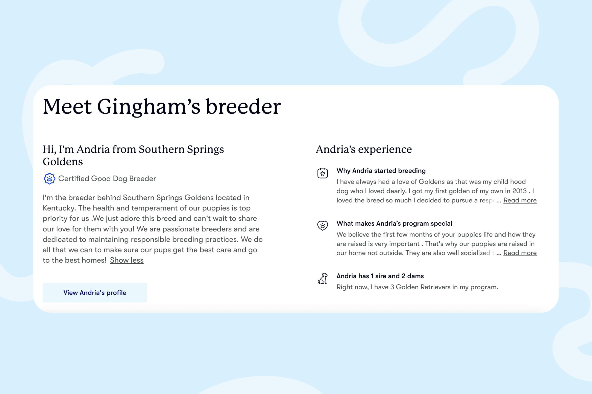 Buyers are eager to learn more about the person behind the puppy! This is a great opportunity to show off all of the work you put into your program and why it's so special. Share more about why you started breeding, your experience, and more by adding details to the "About" section of your profile.