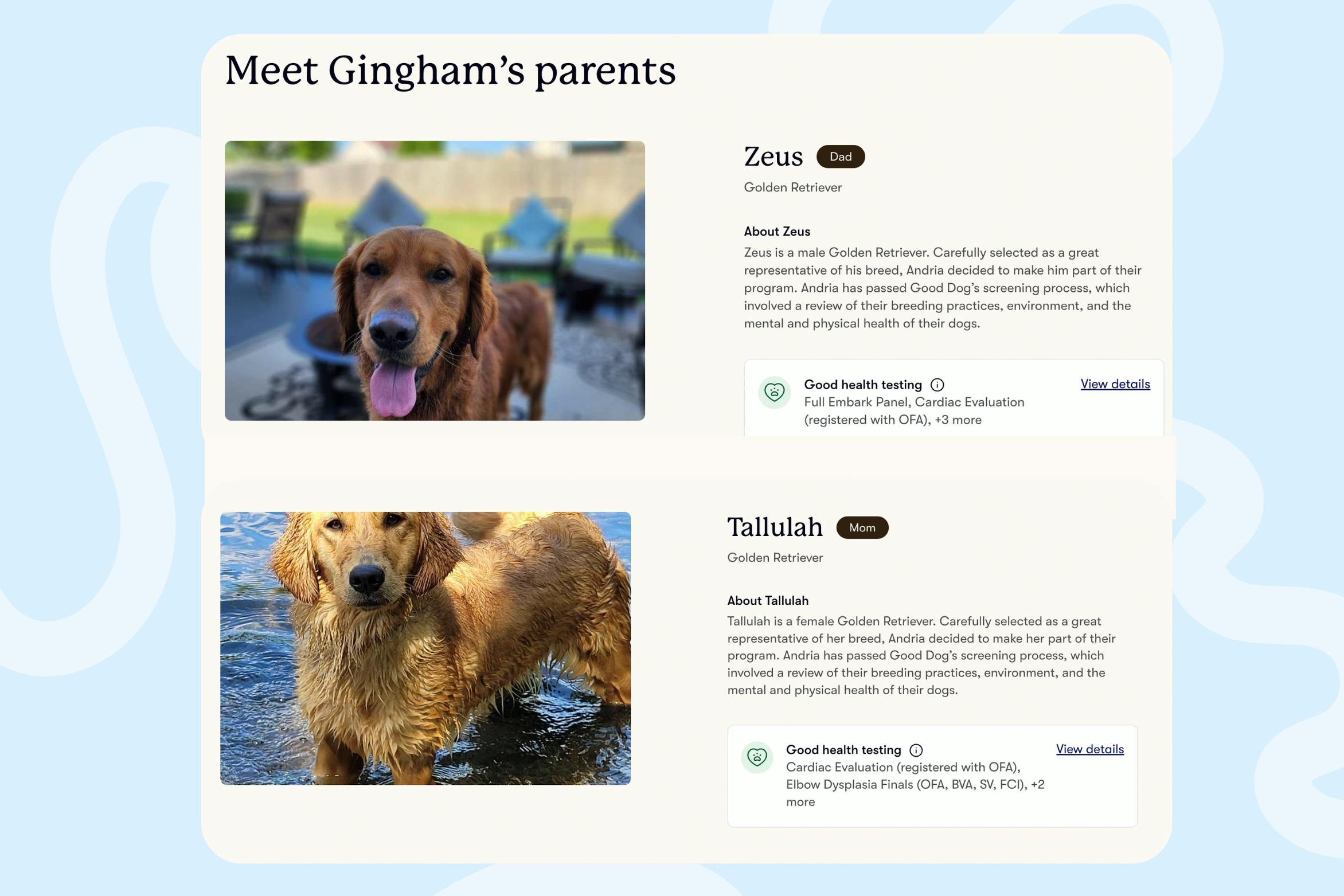 Plus, when you add a litter whose parents have both received Breeding Dog Badges, those pups will automatically receive a special health testing designation which highlights that their parents have verified health testing. This designation will show up in puppy search results and on your Good Breeder profile, and help buyers learn more about your program’s commitment to health testing.