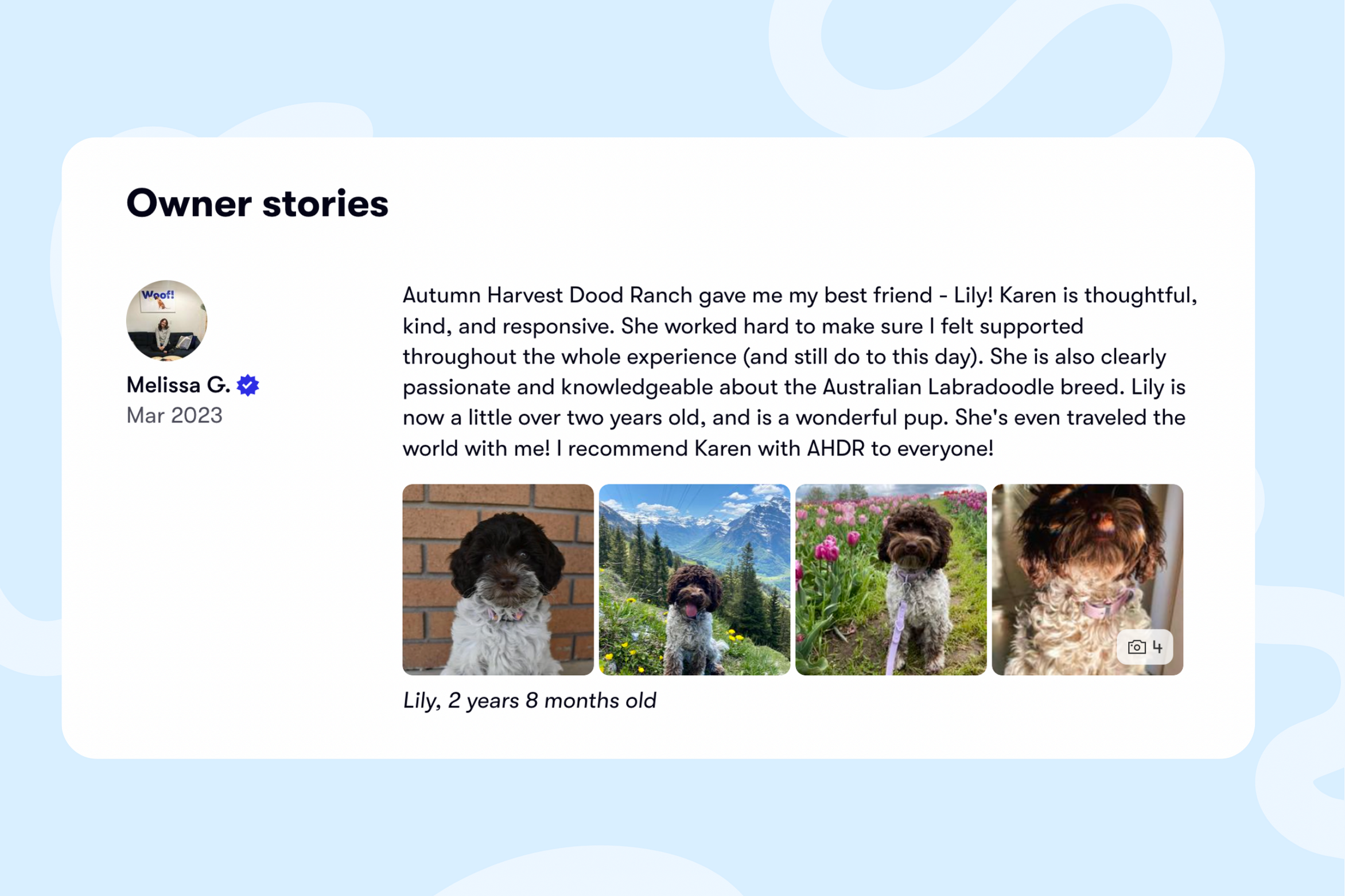 After a Good Dog buyer completes a payment to you on Good Dog, we’ll automatically invite them to share their experience working with you by submitting a Verified Owner Story. Verified Owner Stories appear on your Good Dog profile and in search results, so you can show off your happily placed pups to potential buyers who are looking to learn more about what it’s like to work with you, and share a glimpse of how your pups are doing in their new homes.