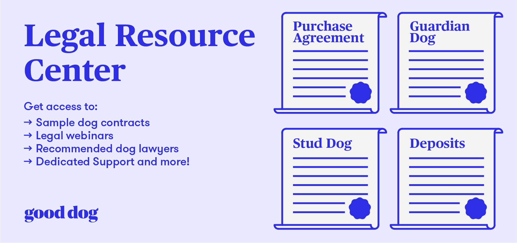 The Legal Resource Center is exclusively available to members of the Good Dog breeder community. To access it, create a Good Dog account (it only takes a few seconds) and complete our quick questionnaire.