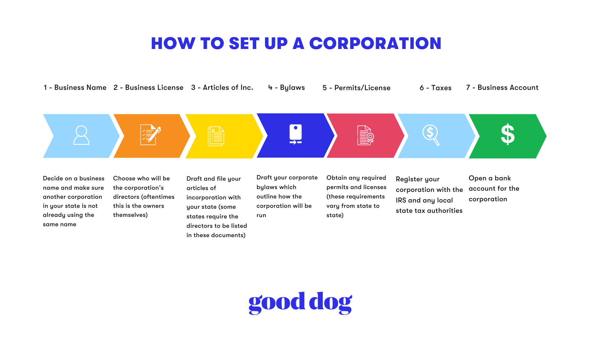 Starting a corporation is a bit more involved than starting a sole proprietorship or partnership and the requirements vary from state to state. The type of corporation (S versus C) also requires specific rules, the below is just a general guide. As mentioned above, it may be helpful to consult an attorney or financial advisor if you have any questions.