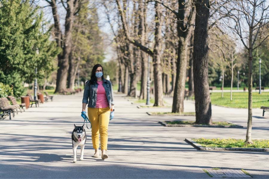 While no cases have been documented where a person has been infected from touching their dog, it may be possible that if an infected person coughed or sneezed on your dog you could be infected by touching their fur and then your face, mouth, eyes, or nose. Therefore, it is best to keep your dog at least 6 feet away from other people and dogs when out walking. Wash your hands with soap and water after coming in from walking your dog and sanitize with hand sanitizer after touching door handles, lids to poop cans, gates to exercise yards or dog runs, and any other surface or object you touch while out on your walk.