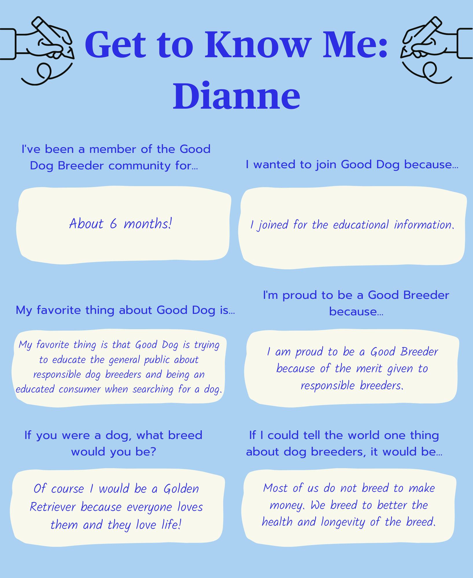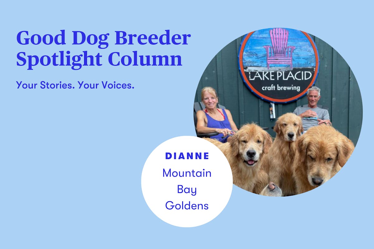 We’re so excited to introduce you to this month’s Good Breeder columnist, Dianne Eves of Mountain Bay Goldens!