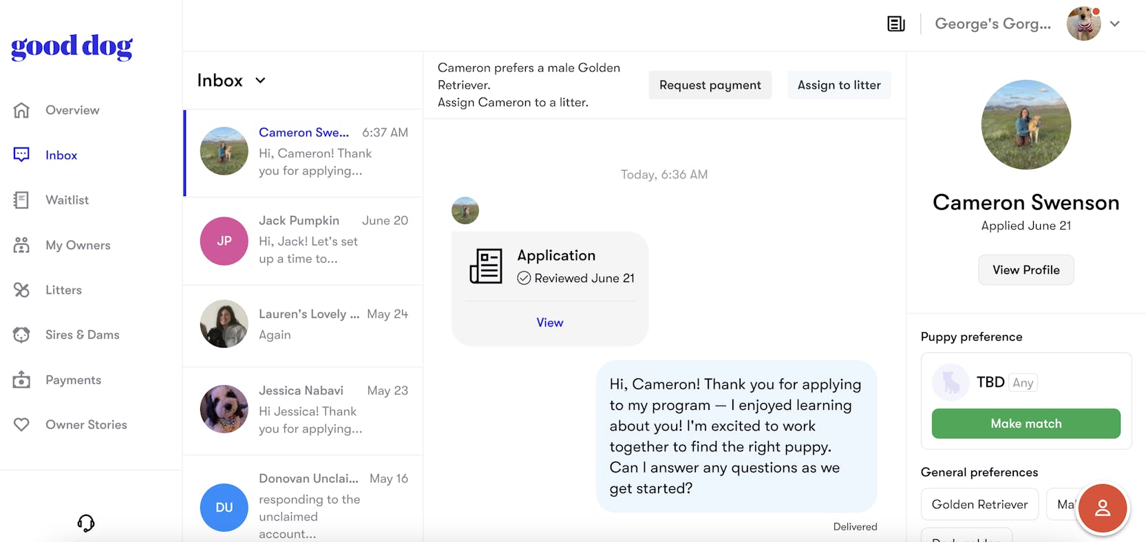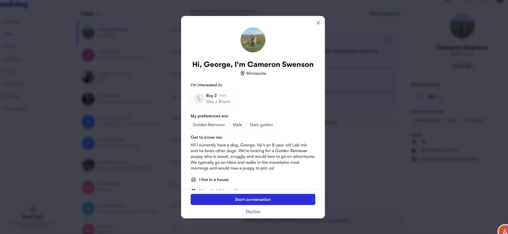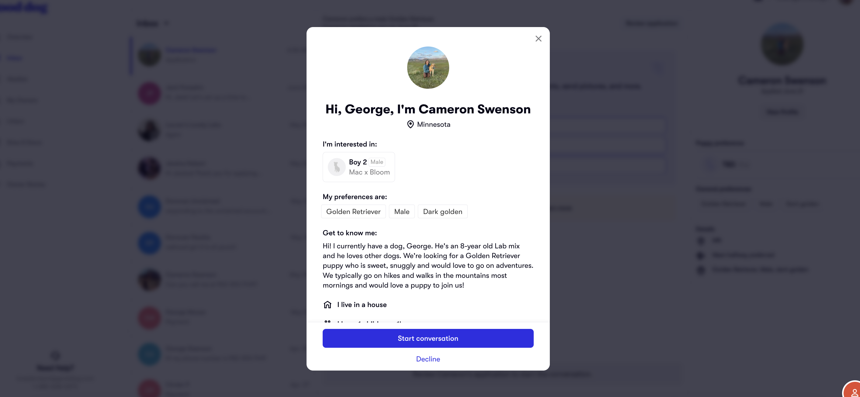 Once you list a born, expected, or planned litter, you can start to receive applications from Good Dog buyers. Review their application, and use Good Dog’s Messenger to chat with them to find out if they're right for your program. This is your opportunity to screen and get to know applicants. Simply review and approve an application, or select 'Start Conversation' and agree to Good Dog’s On-Platform Payment Policy, to start chatting with an applicant.