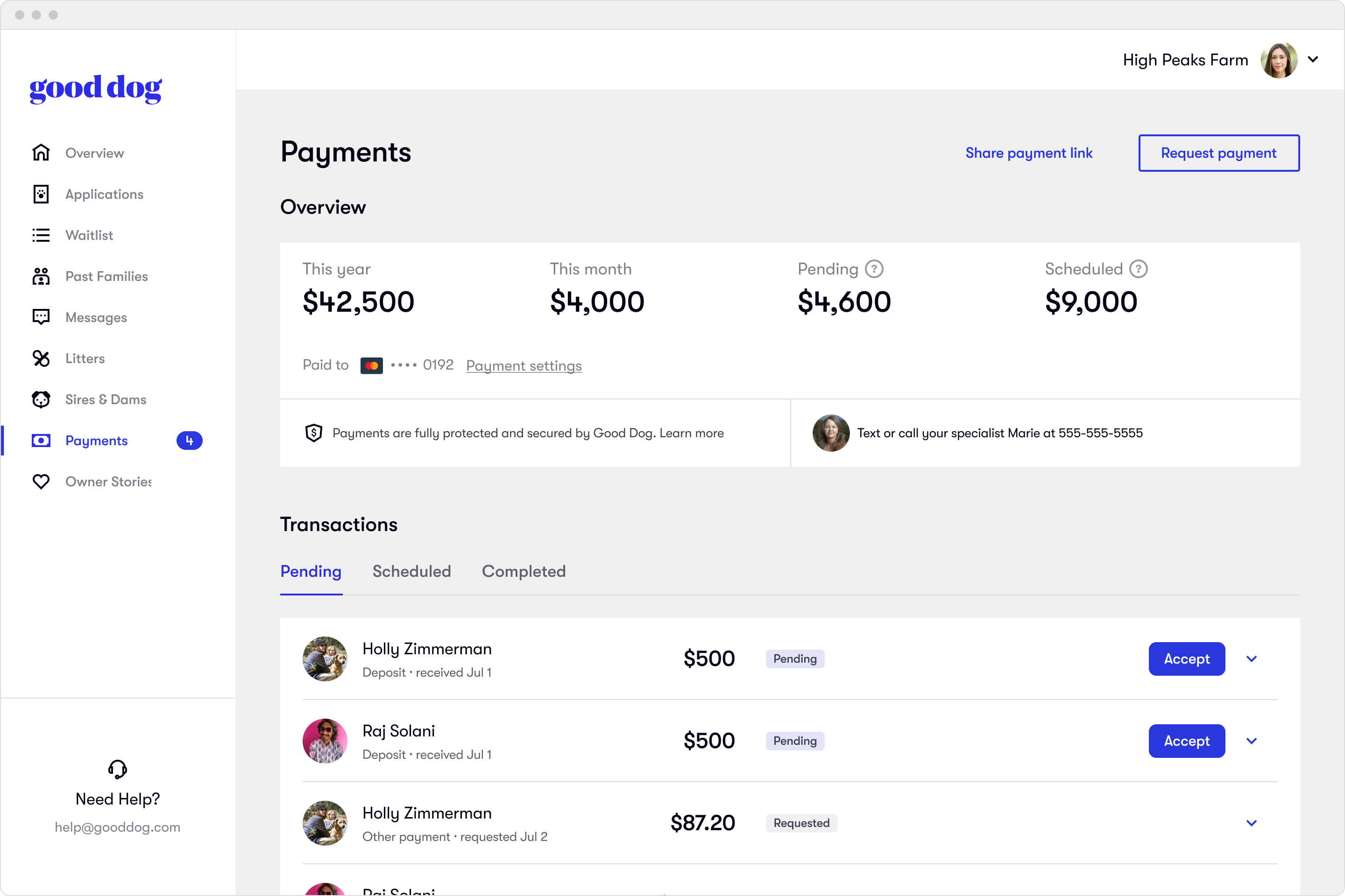Every payment you receive through Good Dog is protected by The Good Dog Breeder Guarantee, which means you’re protected from scammers, chargebacks, canceled payments, and unauthorized refunds. Learn more here.