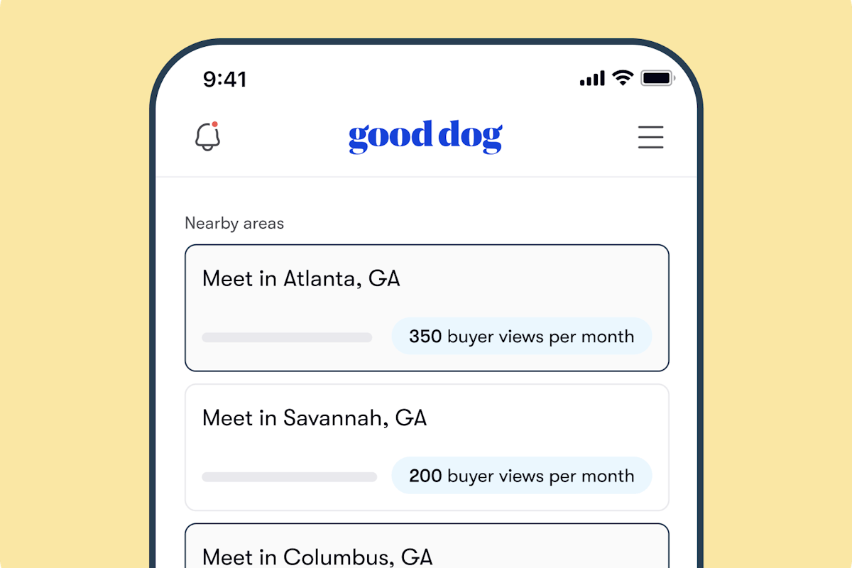 Your puppies will appear in local search results for all your selected Meetup Areas, increasing your visibility to more Good Dog buyers. For example, if you're a few hours outside of Dallas, you can add it as a Meetup Area to connect with more buyers. This helps you find even more perfect matches for your puppies while maintaining your high standards for placement.