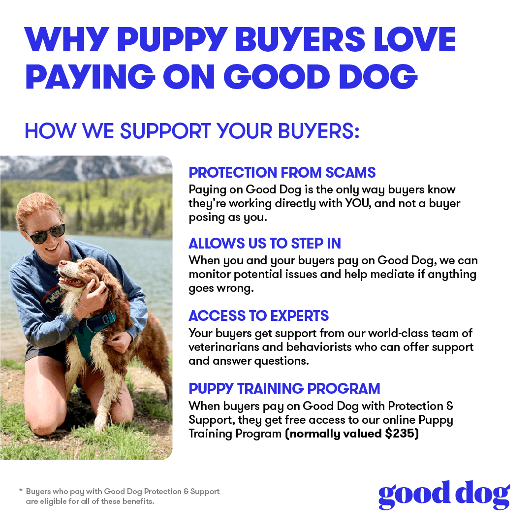 *Plus, set your pups and new owners up for success with Good Dog’s Puppy Training Program, which is part of the optional protection and support we offer puppy buyers making payments on Good Dog (or your buyers can choose our no fee option)!