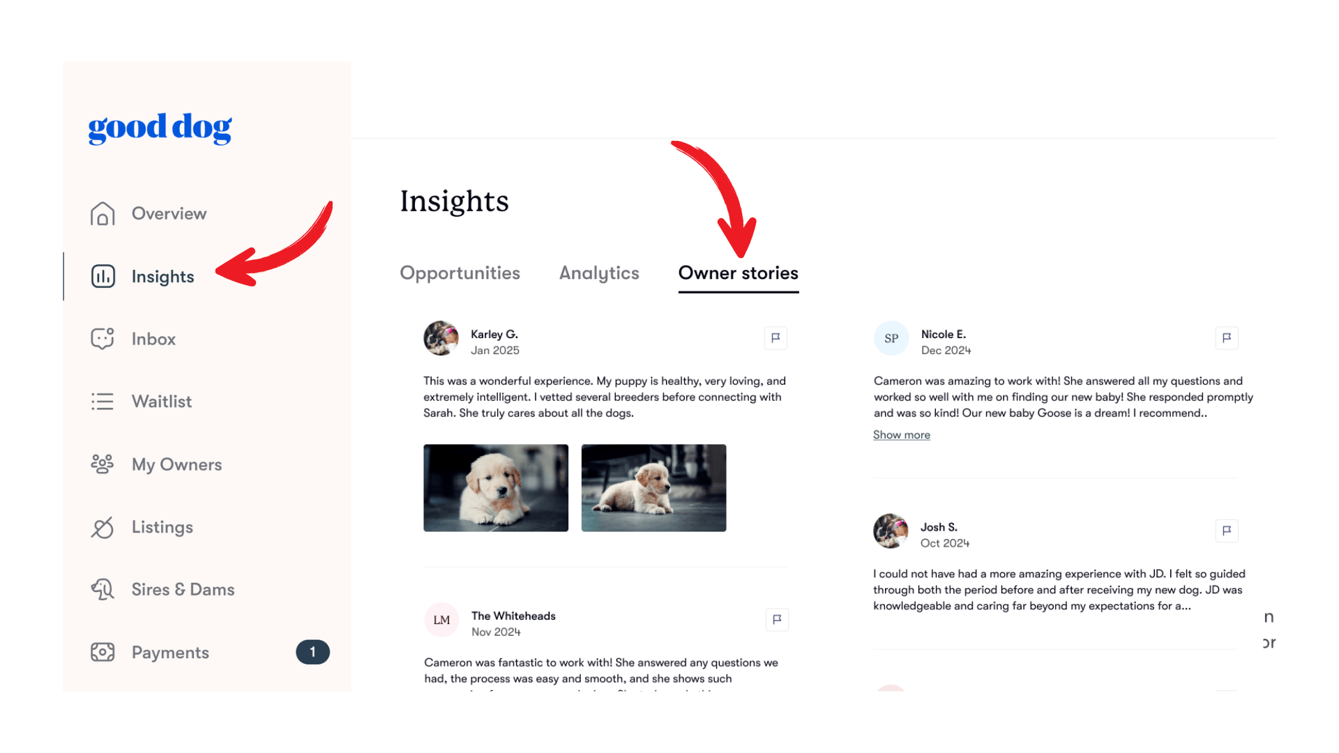 You can view your Stories by simply logging into your Good Breeder dashboard, navigating to your Insights tab located on the left side of your dashboard, and then choosing the “Owner Stories” tab at the top of the screen.