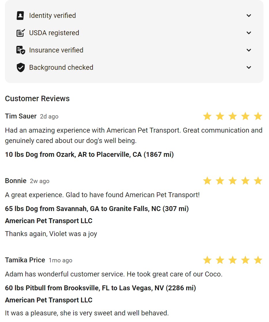 Each driver is background checked, but will have a different level of experience transporting pets. That’s why it’s a good idea to get to know potential drivers to make sure they’re a good fit for your needs before hiring them.