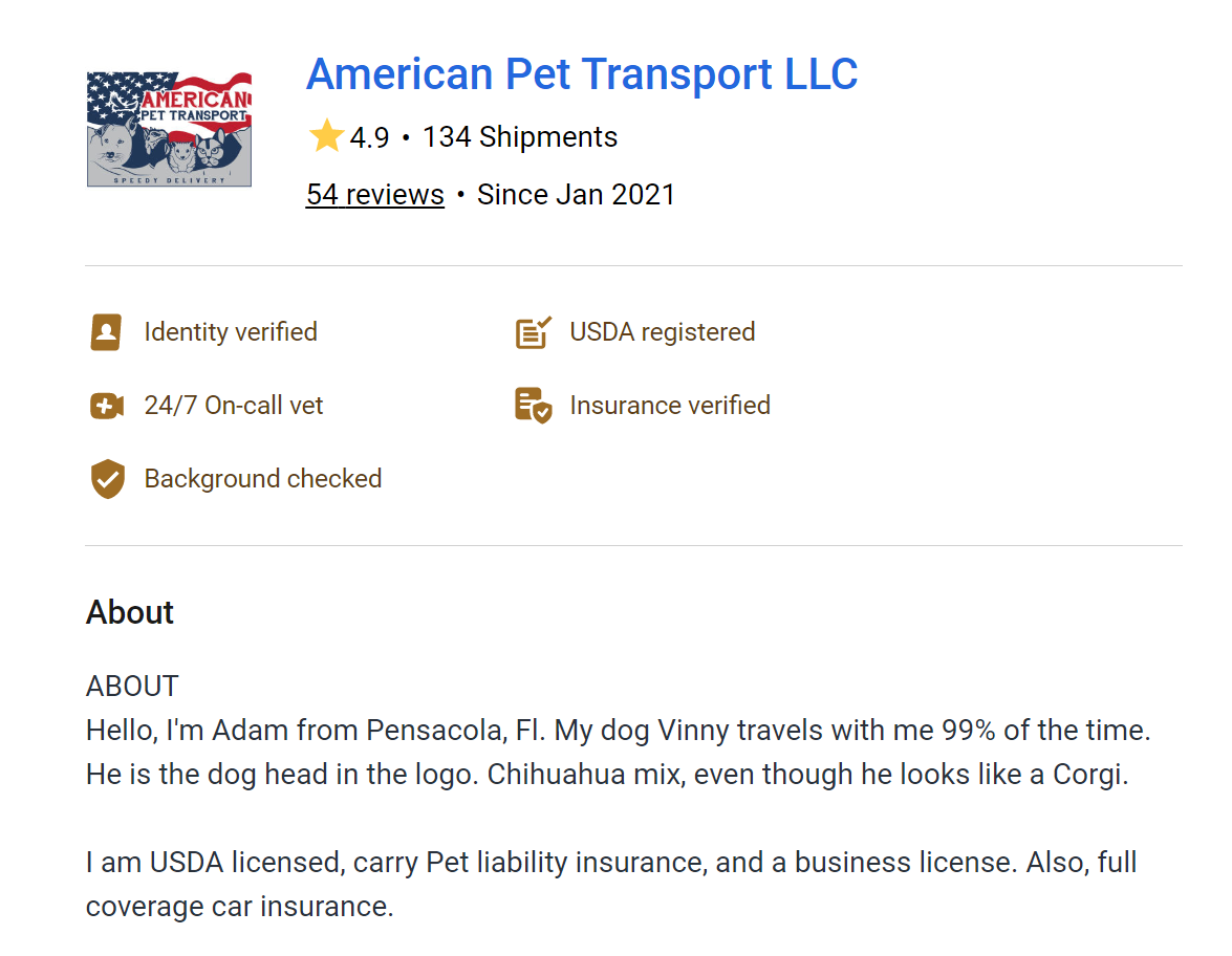 CitizenShipper displays information on a shipper’s profile about their background check and whether they have verified USDA registration and pet insurance. We highly recommend using a transporter that is both registered and insured. If your puppies are being transported from one state to another, there may be state-specific requirements, including health certificates and proof of vaccination.