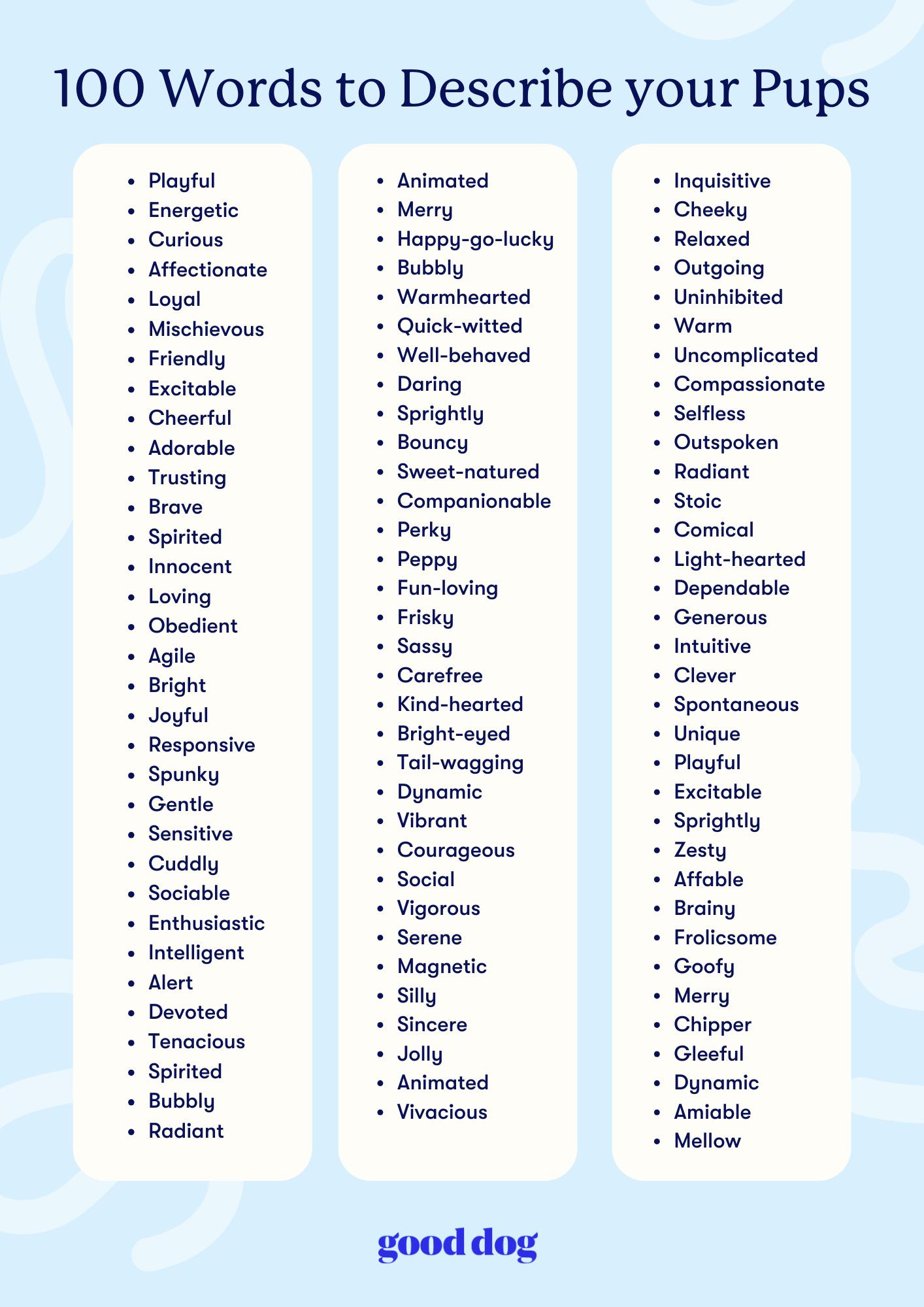 Are your puppies so cute that you’re struggling to find the right words to describe them? Don’t worry - we put together a list of 100 words you can use to portray any puppy personality.