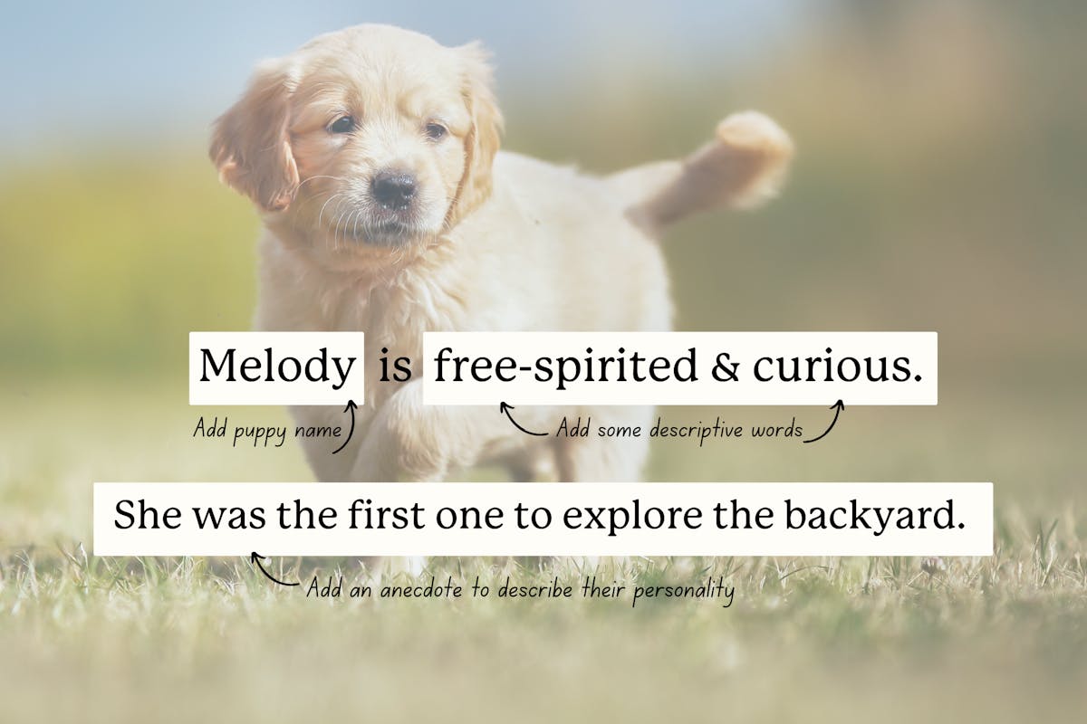Whatever you decide to share in your puppy description should help exemplify the core parts of your pup’s personality. For example, if one of your pups is brave, you might want to talk about how they conquered their first vet visit!