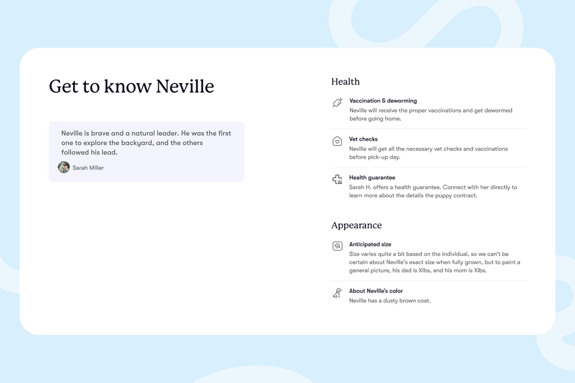 Personalizing your puppy descriptions can be that extra touch that brings your listings to life, and helps potential buyers connect with your pups! Adding detailed descriptions is a great way to showcase your pups’ emerging personalities and help buyers get a better understanding of which pup may be the right fit for them.