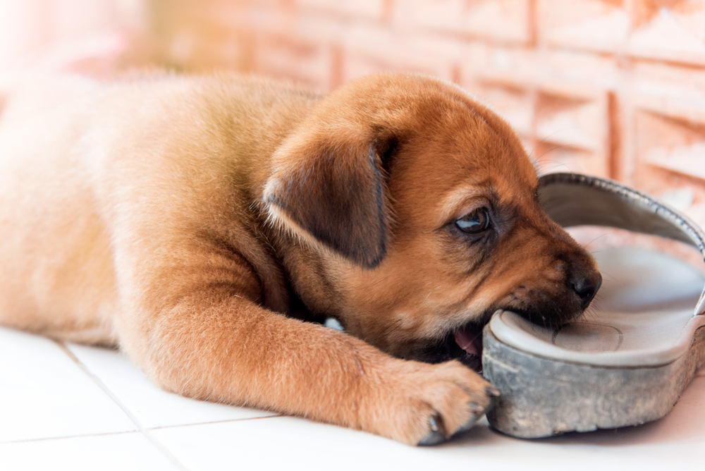 Get started with chew-training right away, so you can let your pup know it’s okay to chew, just not on your shoe.