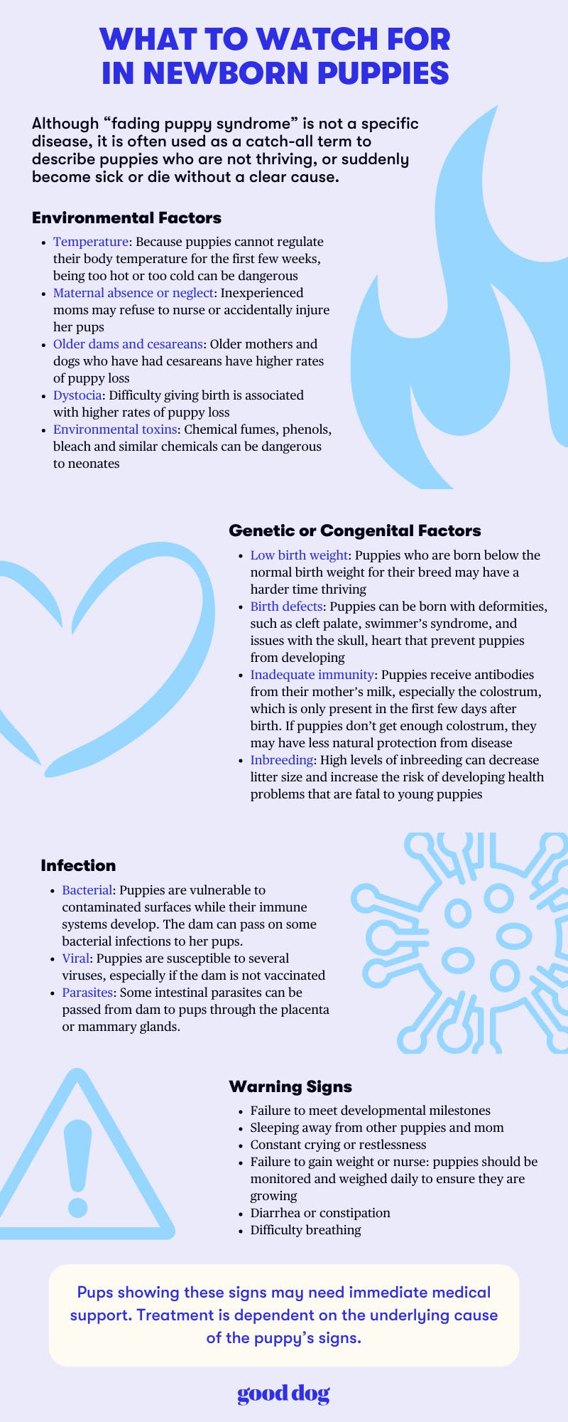 Unfortunately, it is unclear exactly what factors consistently cause puppies to die. Prognosis for puppies who fail to thrive can be poor, but we encourage breeders to do what they can within their programs to minimize loss and to ensure that puppies have the best chance of survival. If several puppies in your program have passed, your veterinarian can help you assess what might be contributing and necropsies can help you obtain more information about what may have contributed to the puppy’s death.