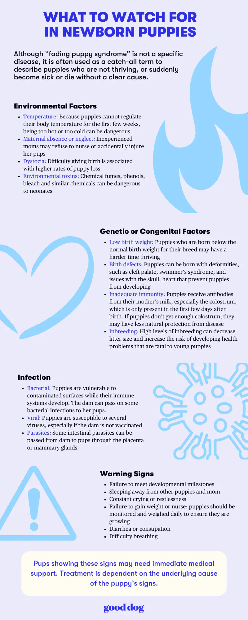 Early intervention will give puppies the best chance of survival. It is critical to prevent dehydration, hypoglycemia, hypothermia, and infection.