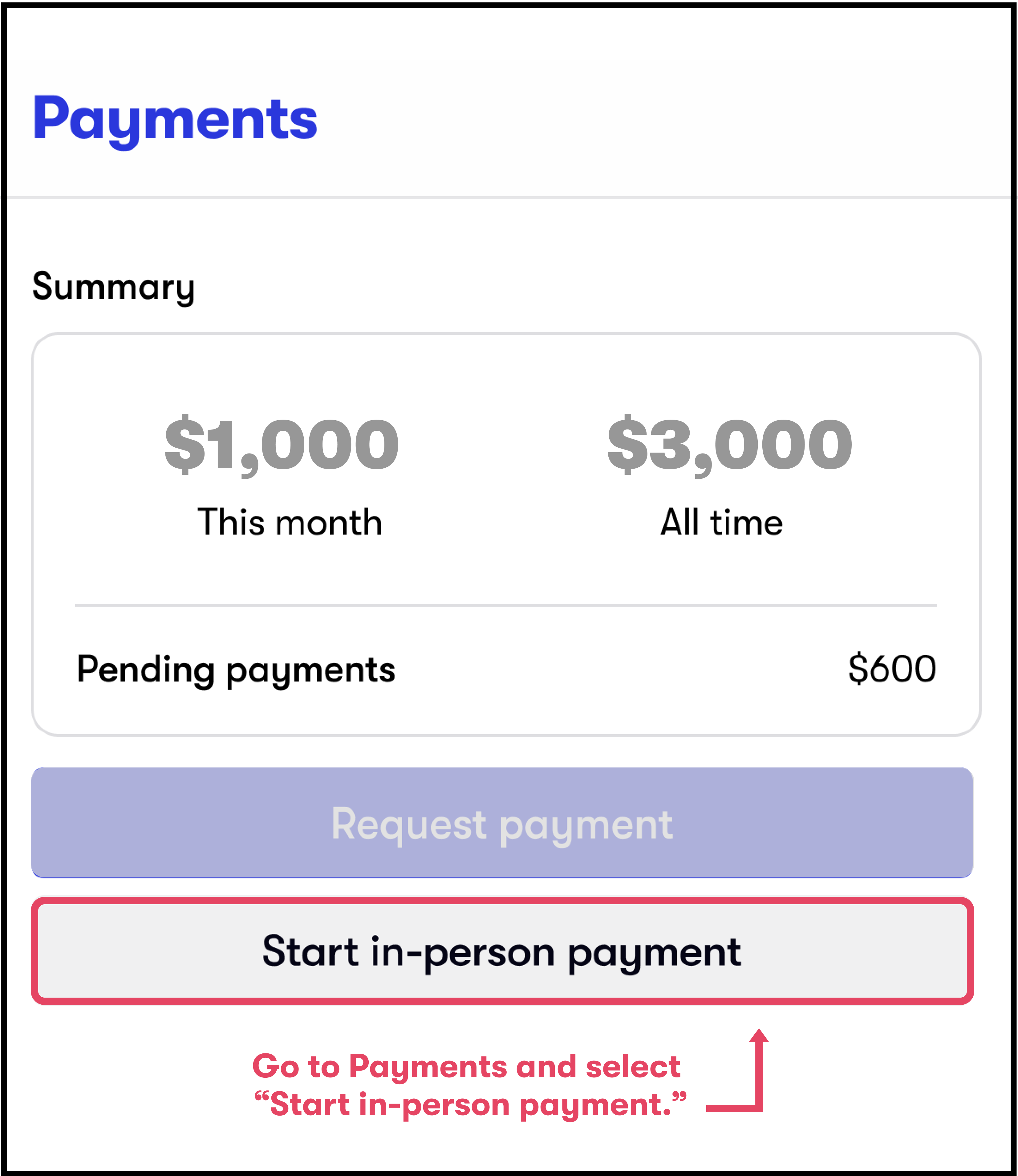 From the “payments” tab, click request payment and follow the prompts to send a payment request. You can also click Start in-person payment from your payments tab. Your unique QR code will show on your screen for your buyer to scan and complete payment or click ‘Share’ to send via email/text/airdrop your to your buyer to complete the payment.
