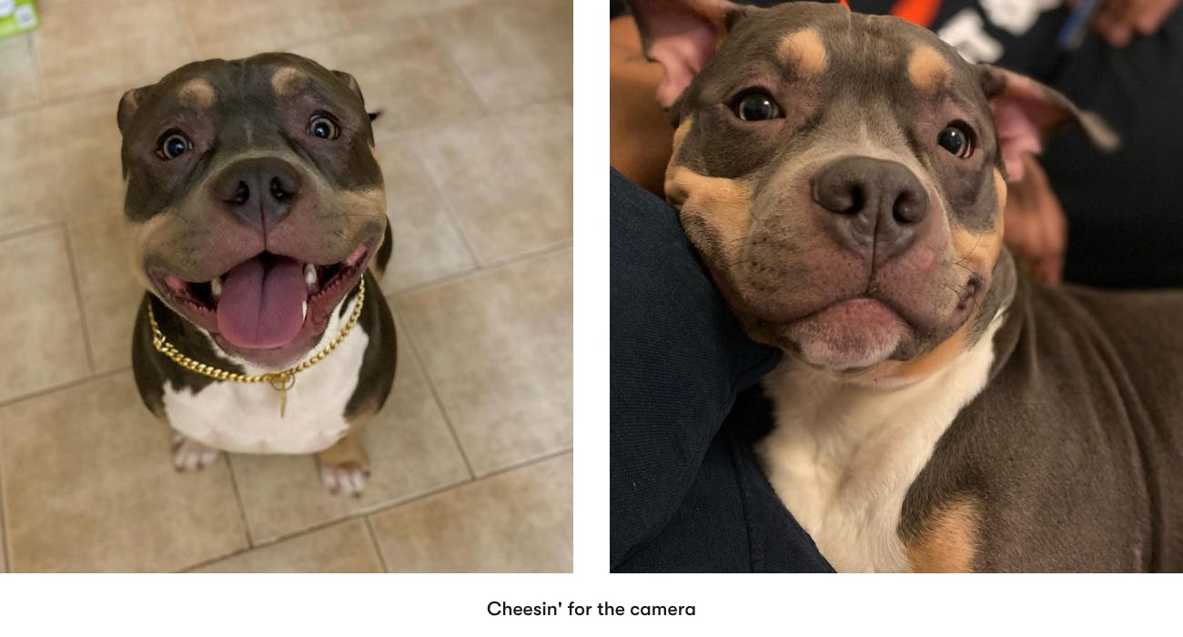 They knew from the start what breed they were looking for. “My husband was set on an American bully, specifically a tri-blue,” Geraldine Donadelle told Good Dog. “We did our research and started educating ourselves on the breed, and went for it.” During one of their conversations about their future puppy, Donadelle decided to do a web search for “reputable American bully breeders,” just to see what was out there. She found GoodDog.com at the top of the search results, and everything began to fall into place.