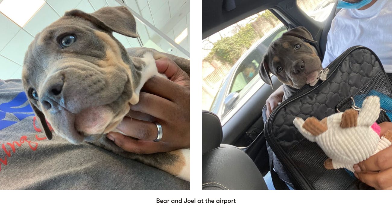 When Joel and Bear touched down safely at JFK Airport in New York, the Donadelles met him at the gate, and the big city chapter of this puppy’s journey began.